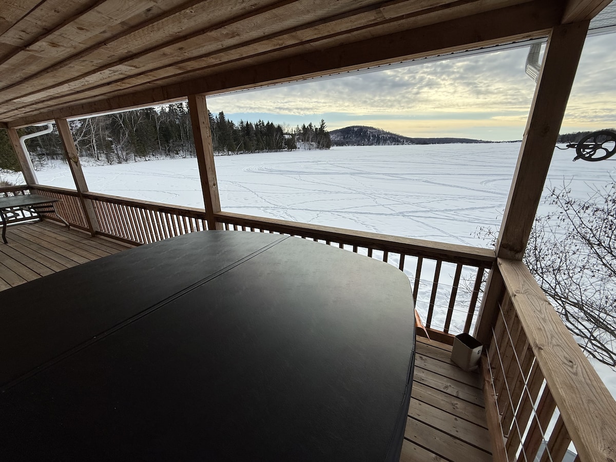 A calm lake chalet in wood, between two regional parks, minutes walk from nature trials and off the beaten path. East windows let the happy morning light on natural materials and heated floors. In the evening, a cozy cinema with ambient sound by a fireplace, a second media room with a turntable ideal for music. Outdoors, a hot tub, a wood-burning sauna, a fireplace by the lake and a slide. Cross-country ski, snowshoe trails are minutes’ walk, and snowmobile routes start right at the driveway.