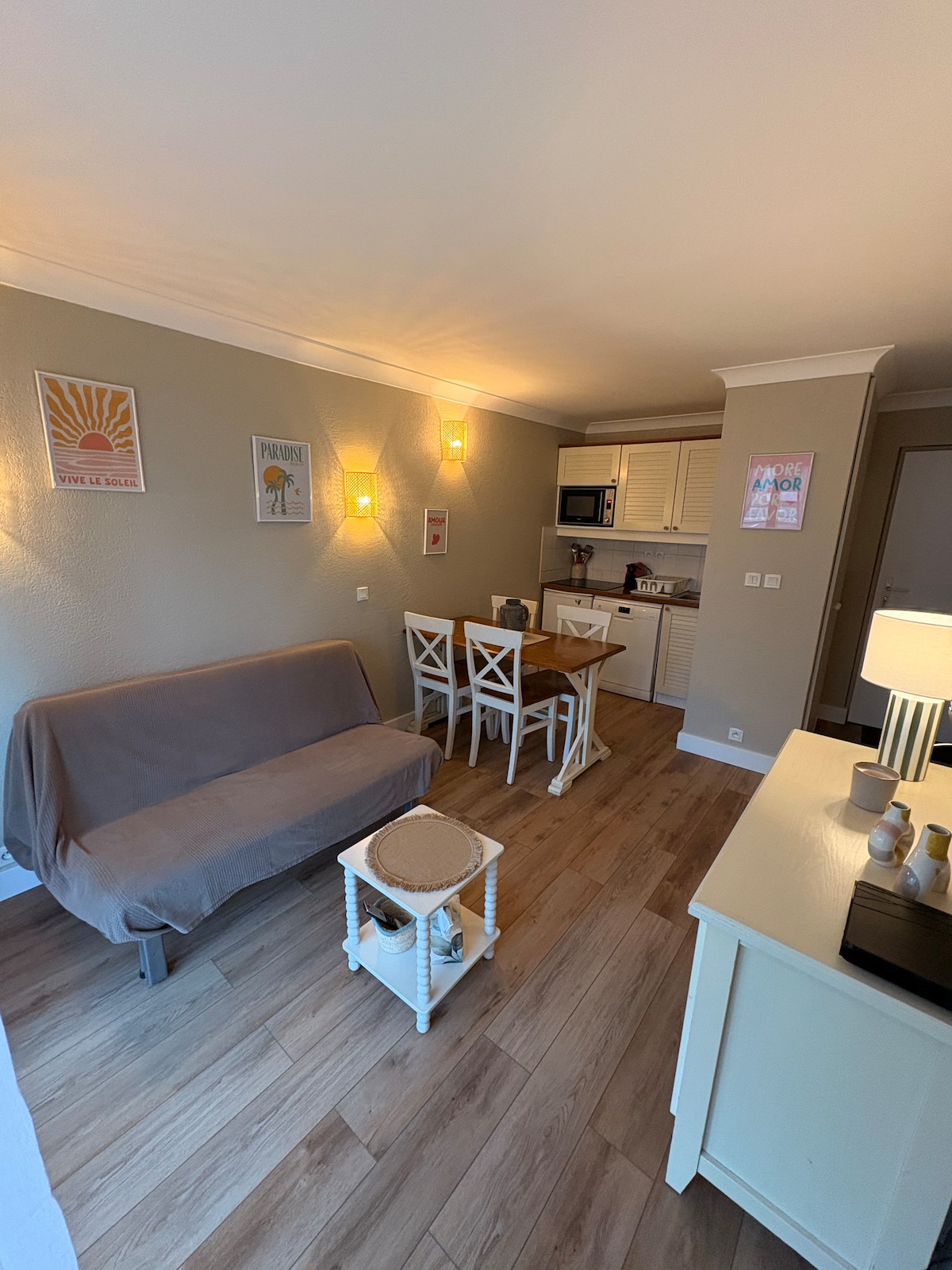 This charming T2 for 4 people and its private parking space is located 100 m from the beach and close to the center. All shops are within walking distance. Completely refurbished, it has a bedroom, a living room with sofa bed and an American kitchen, a bathroom with a walk-in shower, a separate toilet and a balcony equipped with its living room