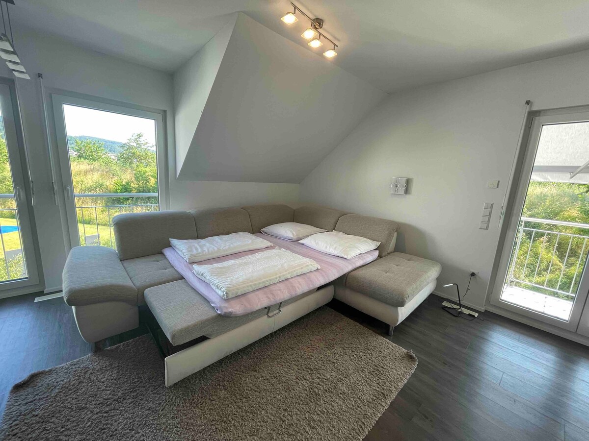 In the middle of the sports community of Heddesheim is the lovingly renovated, spacious apartment for 1-7 people on the upper floor of our former farmhouse. You will find "4 bedrooms" (see pictures), 2 bathrooms with shower and toilet, a kitchen with spacious dining area, as well as a living room and a large lounge area in the former granary for playing, listening to music, reading and chilling. A washing machine, dryer, 2 high chairs and 2 baby cribs are provided.