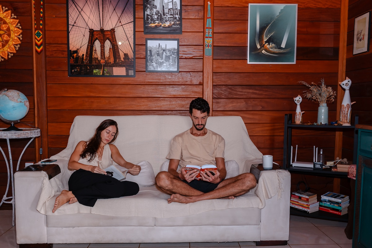 Cozy semi-detached wooden house with 1 bedroom, bathroom, living room and kitchen. We offer a shared outdoor area with 2 other houses, a swimming pool, a gourmet area with a barbecue grill and a beautiful landscaped garden. Located on a quiet street, near beautiful beaches, such as Joaquina, Praia Mole Galheta and Lagoa da Conceição. In the vicinity, you will find bars, restaurants and supermarkets.