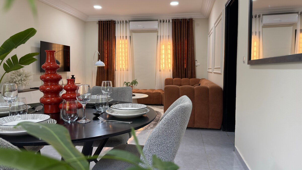 Stay in the heart of Abidjan in this beautiful new apartment, peaceful and warm, tastefully decorated in natural tones and a modern atmosphere conducive to relaxation. This spacious and fully privatized apartment is located on the 2nd floor of a quiet and secure residence, perfect for a business trip or a relaxing vacation. The accommodation is located 25 minutes from the Plateau, 35 minutes from the airport and 10 minutes from Abidjan Mall.
