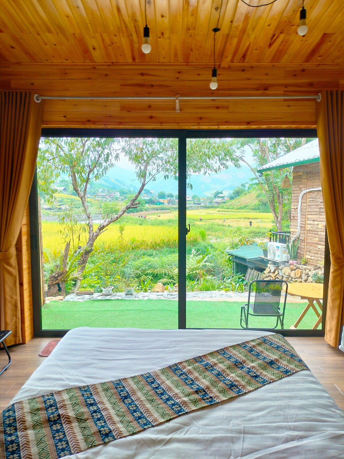 Waking up to the sound of flowing streams, opening the door to the Ta Van rice fields. A private, quiet wooden bungalow, perfect for relaxation and nature-loving couples.”