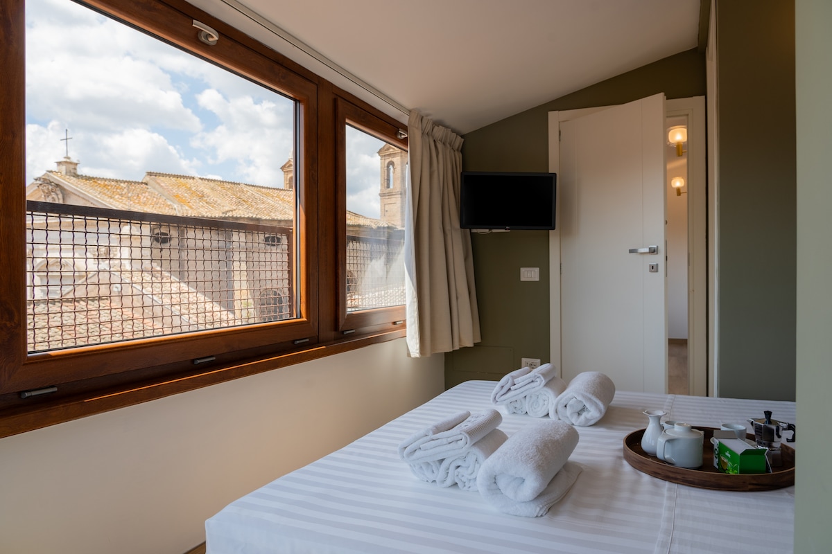 In the center of Rome a private penthouse open louvered window coverings in a living room to maximize light and reveal wraparound views of Central Rome and St peter's basilica. A period fireplace, terra cotta tiles create a traditional feel. Private terrace fully furnished. Two double bed rooms. Ten minutes walk from St Peter's square and Vatican Museums. Overlooking Rome and St Peter's. 2 minutes walk to public transportation, bus & metro will take you easily to all the main historical sites.