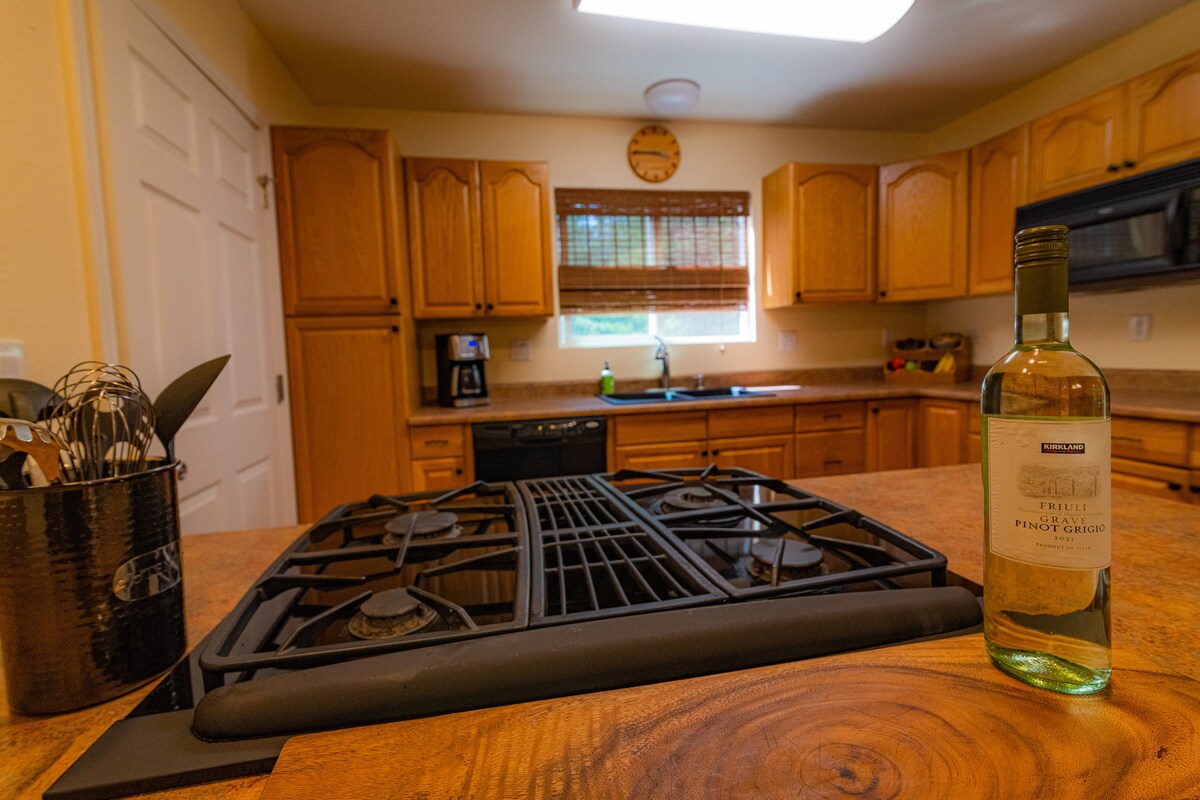Relax with the whole family at this peaceful retreat above a forest of whispering pines. The upper deck overlooks a dense timberland behind the house and has both gas and charcoal grills. The full kitchen has ample amenities for those who enjoy cooking. The spacious living room boasts a lovely sitting area and a 65 inch Smart TV with WiFi. Charging an EV is available for an additional $25 per night.