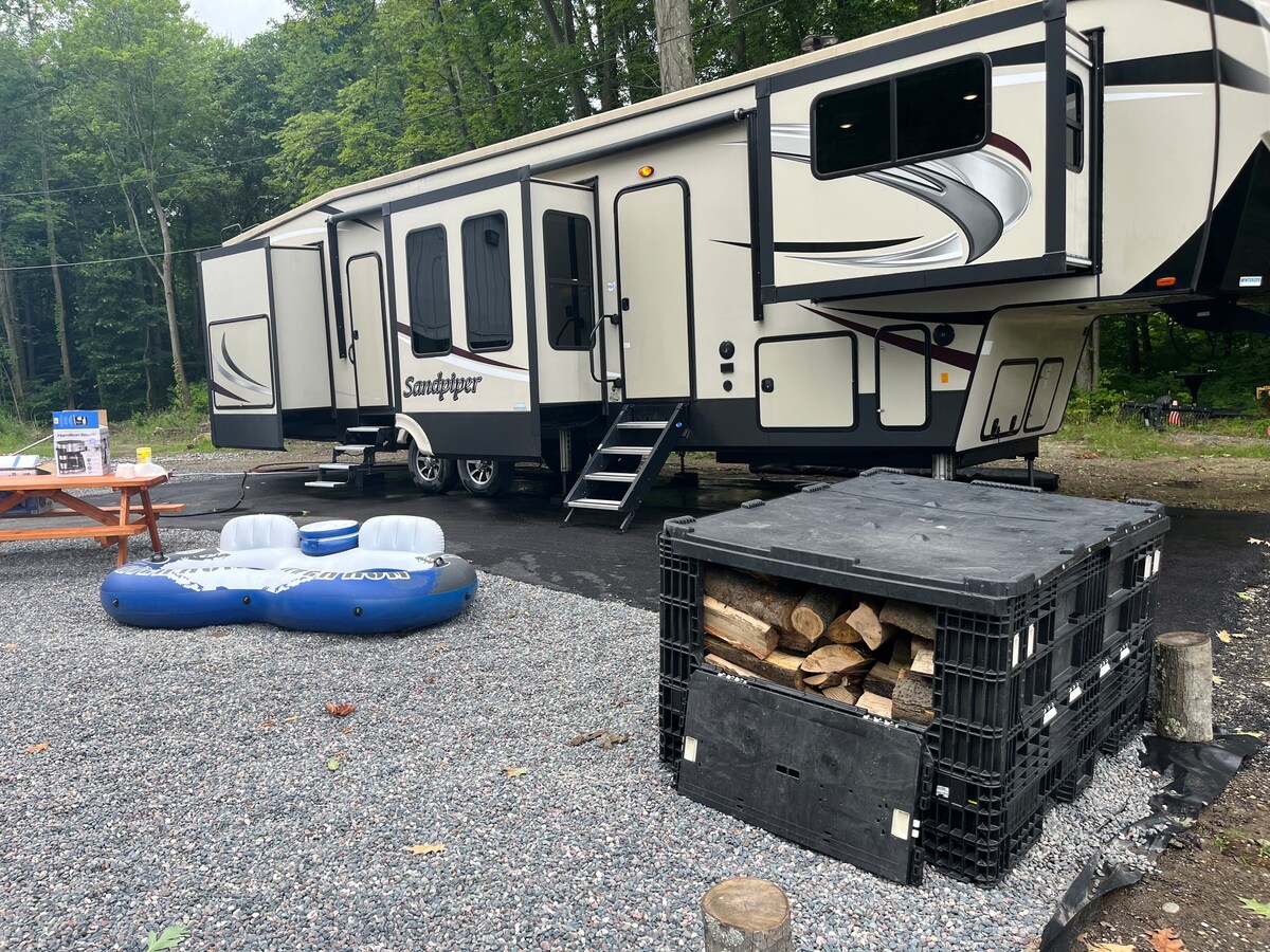 Welcome to our 11-acre property centrally located among the Ashtabula harbor, Geneva-on-the-Lake, and the Harpersfield wineries. We have a beautiful king-sized bedroom and one bath 5th wheel with a full kitchen and all the amenities you would need for a relaxing stay. One sofa bed in the living room can be used for extra guests. There is a one-acre fully stocked pond where you can fish or kayak or just enjoy the serene outdoors. You can end your day around the fire pit outside of your unit.