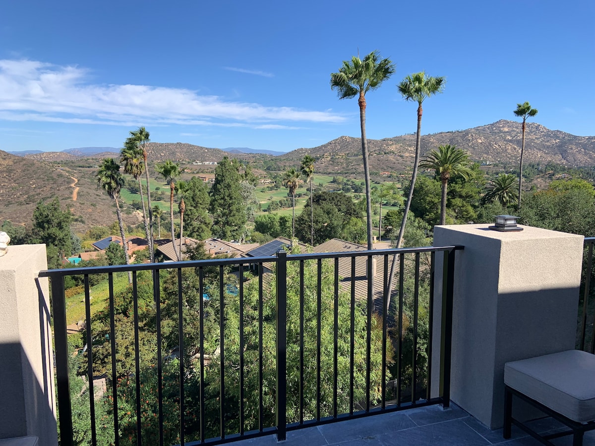 176 Perfect 5.0 Reviews – Amazing views, peaceful and beautiful guest suite on a French estate in San Diego Wine Country close to the Wild Animal Park. A perfect setting to celebrate a special occasion and create memories. Amazing sweeping views of the vinyards/mountains situated on the golf course with full access to the pool, spa, covered parking, EV chg. and private European garden park. Beautiful luxury guest apartment with a kitchen, sitting room, bathroom, steam shower/sauna and bedroom.