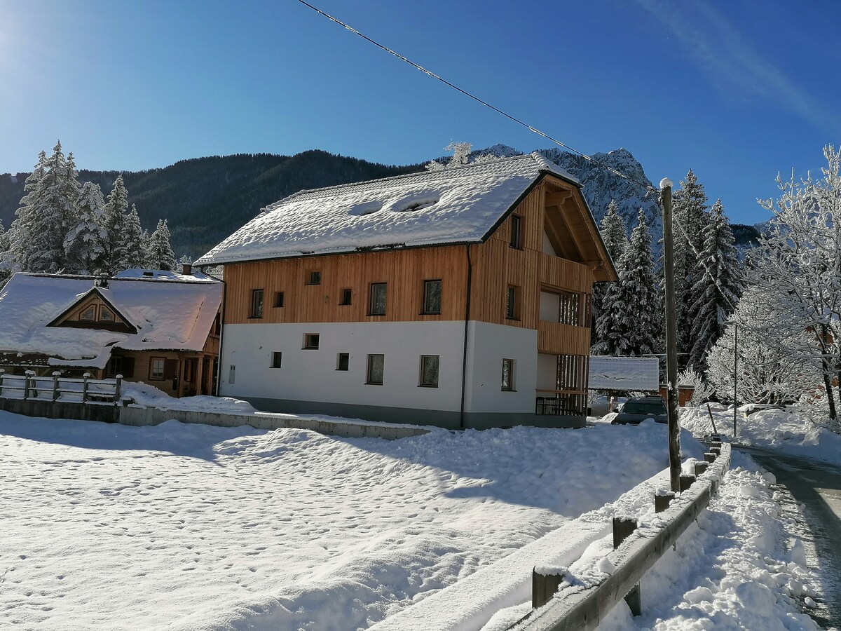 Bright apartment- loft with a great view of the mountains, just a few minutes from lake Bohinj. Black and white with something red - like a cake with a cherry on top :) You'll feel at home and at the same time you’ll be on holidays. Location offers many hiking and bicycle paths and it is close to the ski resorts of Vogel and Soriska planina and a Water park with wellness and only a few kilometres from lake Bohinj, where you can swim, surf, kayak, sup,..., and enjoy the nature.