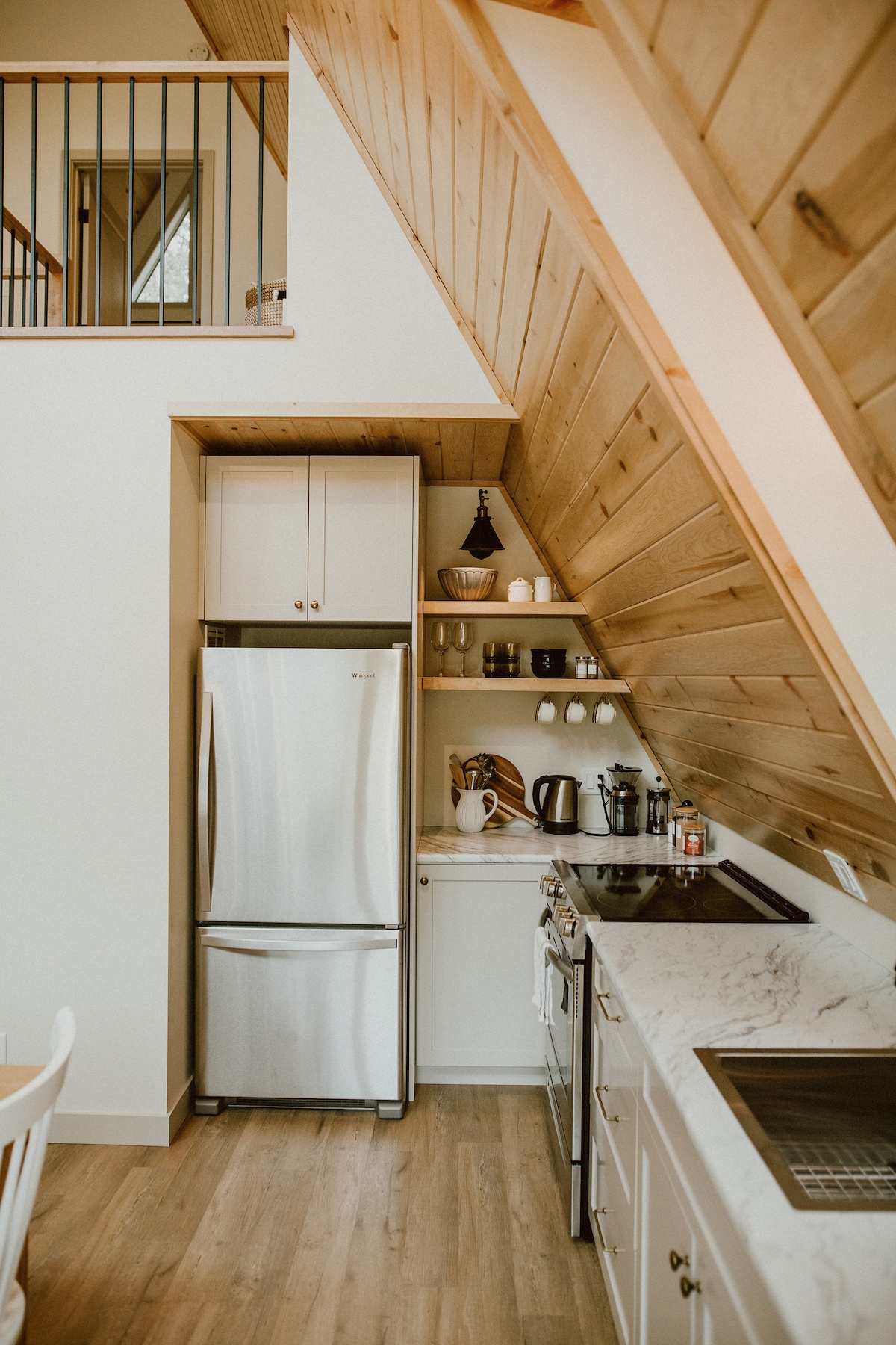 This guest suite with a private entrance, is attached to our main house, where your hosting family lives. It's located in a quiet part of town tucked into the trees with a river and walking path across the street. It would be perfect if your travelling here for work or just need a relaxing getaway. This guest suite was once a chicken coop, now turned into a modern mid-century style house that we lovingly have called the Hobbit House because of it's low ceilings.