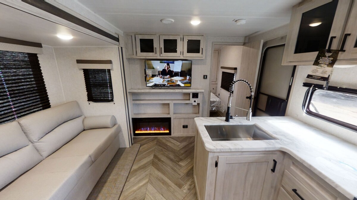 2020 Coachman Catalina Legacy edition with large slide out and bunk house. In the front of the camper is a queen size bed, mirrored closets to hang clothes, Overhead Storage Cabinets plus a Wall-Mount TV. Living room has a Fireplace and Storage Cabinets plus a Sofa/Bed. Booth Dinette with Bench Seat . Full Bath with Mirror Cabinet, and Shower with Skylight. Rear Bedroom Bunkhouse with 3 Bunk Beds, Cube Sofa/Bed, Entertainment Center with TV. Radio and dvd player.