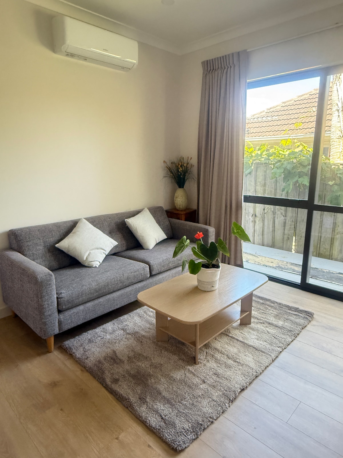 Private & self contained downstairs studio with separate entry, new furnishings and the essentials for a short stay – double bed, sofa, kitchenette, coffee station, TV, and central cooling & heating. 1 min walk to buses heading to Smales Farm, where there are frequent trips to the City Center. Conveniently located near parks, malls, groceries, AUT North, North Shore Hospital & restaurants. Ideal for individuals seeking a convenient and comfortable space. **Kindly read notes below before booking