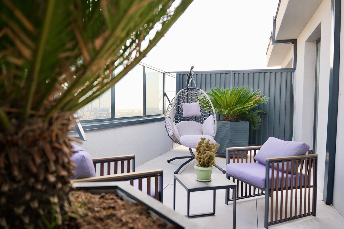 Bine ai venit la Downtown Apartments! Descoperă un penthouse unic in București cu o terasa spectaculoasa, având un total de aproximativ 70 mp2 (terasa) cu jacuzzi, sezlonguri pentru relaxare, balansoar&more. Situat la doar 500 de metri de stația de metrou “Constantin Brancoveanu” și la doar 10 minute cu mașina de Piața Unirii, vei avea orașul la picioare — fie că ești aici pentru muncă, relaxare sau explorare.