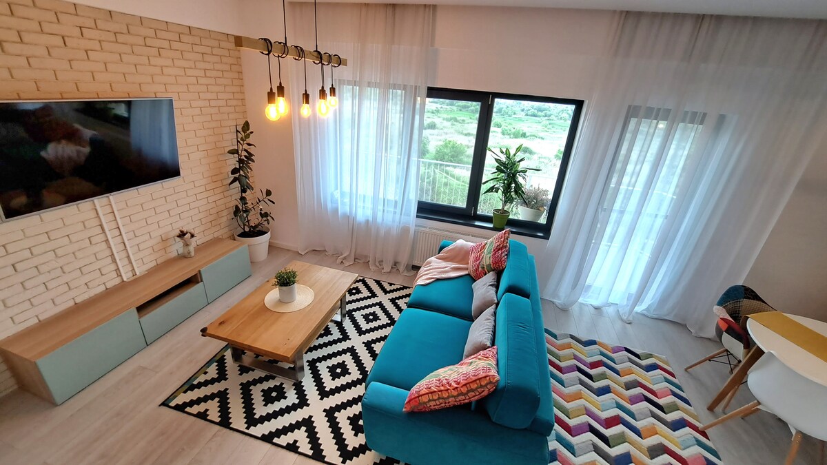 Descoperă confortul și rafinamentul acestui apartament de 2 camere, recent renovat, perfect pentru o vacanță de neuitat sau o calatorie de afaceri. Predomină nuanțele de verde smarald, creând un ambient relaxant și elegant. Apartamentul este complet mobilat și dotat cu tot necesarul pentru un sejur reusit - living cu canapea extensibilă, ideală pentru relaxare sau dormit - baie modernă cu duş, pentru clipe de răsfăț - bucătărie complet echipată, pregătită să îți satisfacă orice nevoie culinară.