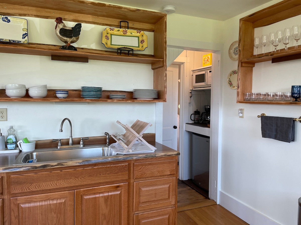 Fox Den is a fully furnished 600 sq ft studio loft apartment with all the amenities that you could need. Eat out or cook in our kitchenette. The view from your 2nd floor deck is stunning with sunsets that dreams are made of. The loft has high, open ceilings that give you a cottage feel that immediately brings relaxing vibes. Hike our 10 acres of trails next door on our glamping grounds, including a fishing pond Your secluded spot is right in the middle of wine country and state Forest trails