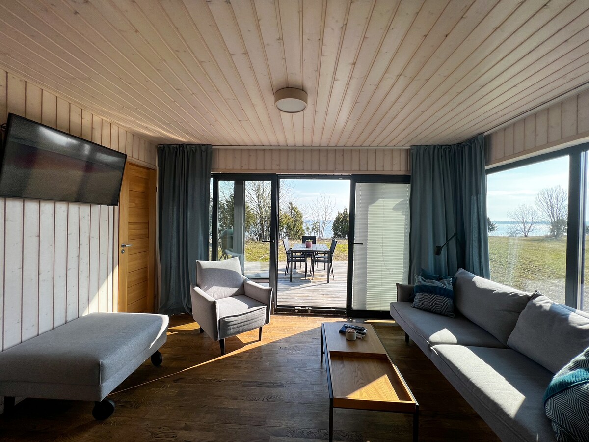 Our small house is located in the private harbor of Ruhve.The 180-degree view of the sea offers wonderful emotions,peace and a perfect opportunity to switch off from everyday life. The house has double bed,a sofa that folds out, a kitchenette,a toilet and a shower.There house is also equipped with Wi-Fi and air conditioning. The price includes the possibility of using a sauna with sea view. For an additional fee,it is also possible to use a hot tub and two SUP boards.