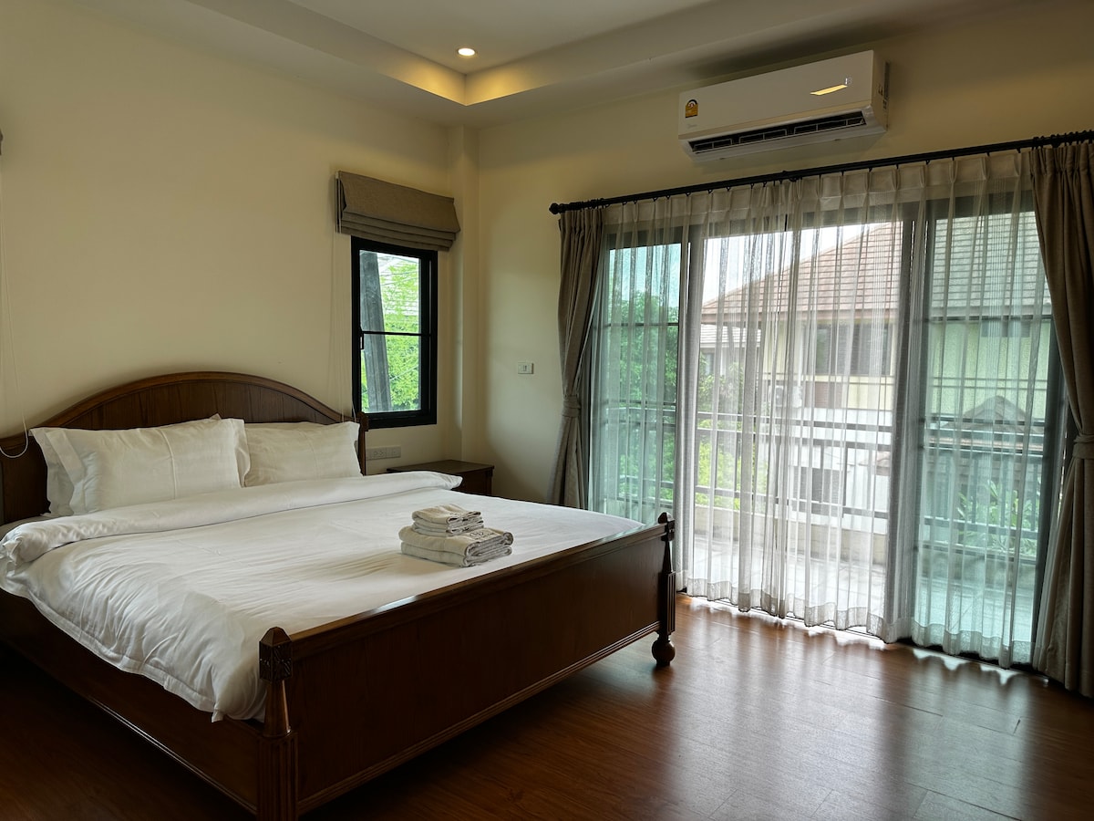 A cozy home in the best area of Hang Dong with 2 bedrooms, 2 bathrooms, and high security.Just 11 minutes from the airport, near Panyaden International School 1 km,Montessori 2 km,SBS International School 2.9km,Kad Farang 1 km,HangDong Market 1.7km,Sports Complex 1 km,7-11 900m,and a golf course 3 km. The modern house features a 55”Google TV with free Netflix,Google home for smart home&lighting,Outdoor CCTV, a remote-controlled gate,a digital door lock, Air purifier,Air conditioning,water heater