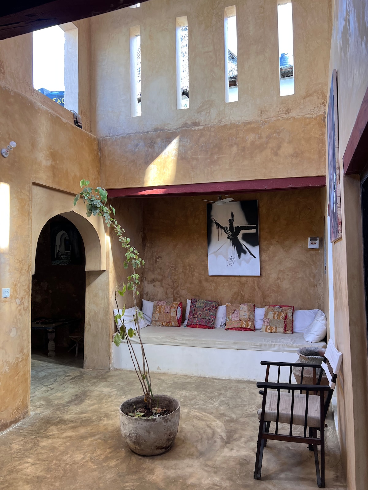 Set along Usita wa Mui, the main street of Lamu Old Town, this flat is the first project of a graduate architect and artist (the host himself). Housed in a 700-year-old Swahili home, it combines history, craftsmanship, and art. The space doubles as a working studio and small gallery with mixed-media works. Facing the lively street, it carries the hum of daily life and stories below — a true immersion into the spirit and creativity of Lamu.