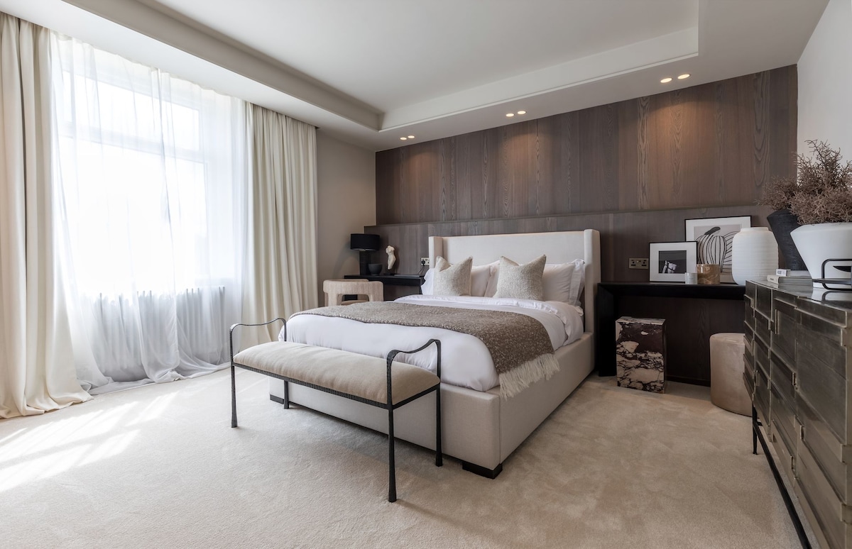 The ground floor accommodation is extremely stylishly appointed with a large, open-plan living/dining room which features Jacobean-style painted wall panelling as a stunning backdrop. Stone mullion windows, beamed ceilings, oak floors and doors lend a sense of rustic charm to the fabric of the building and yet there is every modern amenity. There is access to wooded and landscaped gardens with long-reaching views of the surrounding countryside and a private area to sit and enjoy the location.