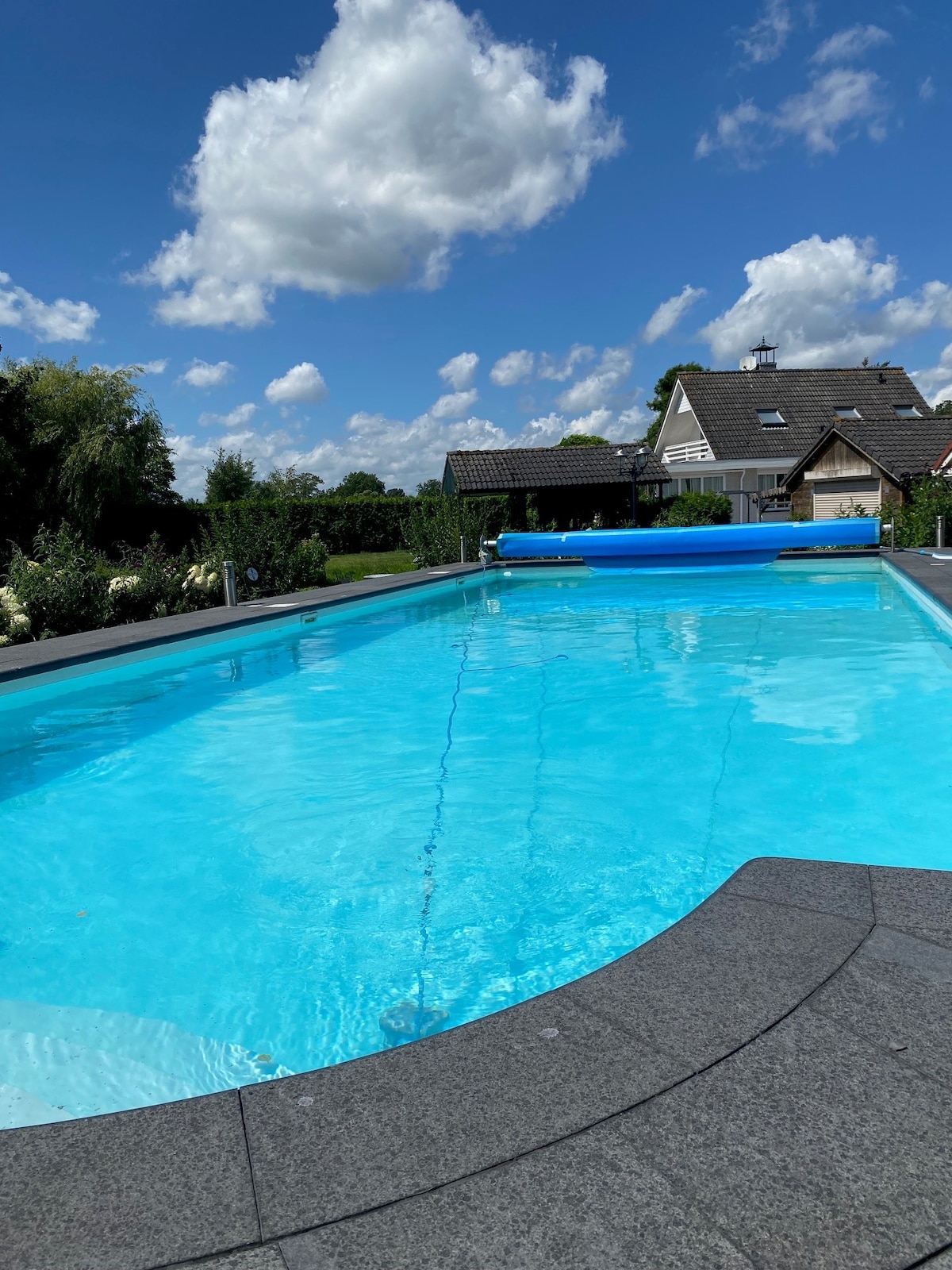 Modern waterfront villa in a dream location, just 20 minutes from Amsterdam. The main guest house is fully equipped and includes a big parking area, terrace, BBQ, large garden, trampoline and a private swimming pool, all surrounded by clear swimming water. A perfect spot for families, friends or business travelers seeking space and tranquility. The property also contains a few small owner‑only buildings separate from the guest area.