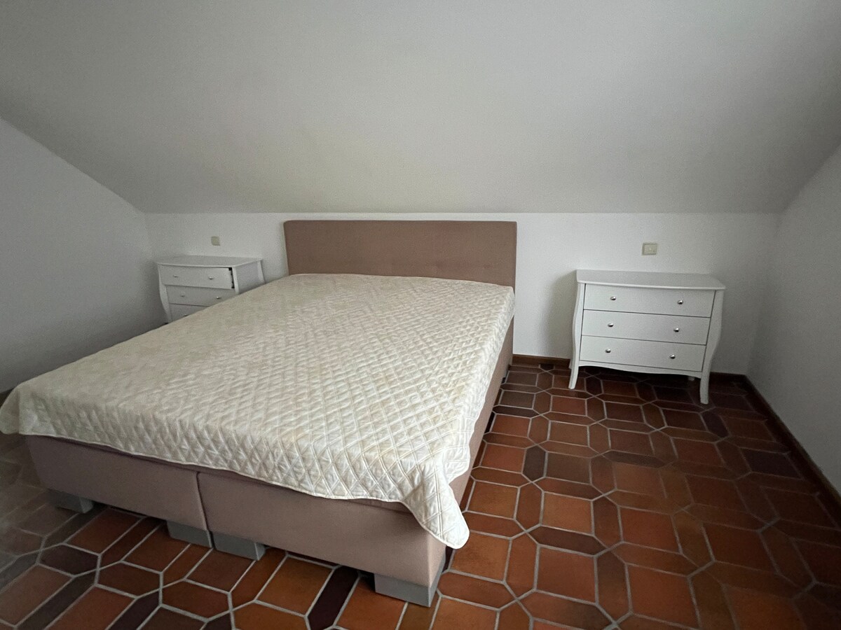 The apartment with 45 m² is located in the marshalling yard settlement Bauernfeind, in the attic of our house. The metro is within walking distance in 10 min. and a stop from the fair (within walking distance 20 min.). The Playmobil FUN Park can be reached in 20 minutes by car. There is room for max. 5 people. There are two bedrooms, 1 x double bed and 2 x single beds. In the open living area there is a small kitchen with dining table and 1 x sofa bed.