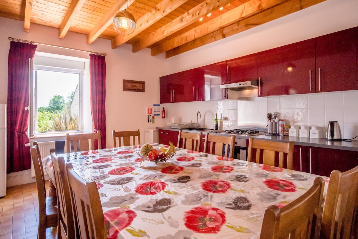 Professionals on a mission or vacationers discovering the 4 corners of Brittany, our ideally located cottage will delight you - For its comfort: Bright, spacious, 5 large bedrooms, 2 bathrooms + 2 powder rooms on the ground floor + upstairs, 500 m2 of private macadam parking for any vehicle - Through its Natura 2000 environment: Quiet, In the countryside Fishing 1 km away 1000 m2 lawn Trampoline, Bowling alley, Games Original terrace Summer kitchen with barbecue Close to beaches and festivals Baby-friendly Dogs allowed