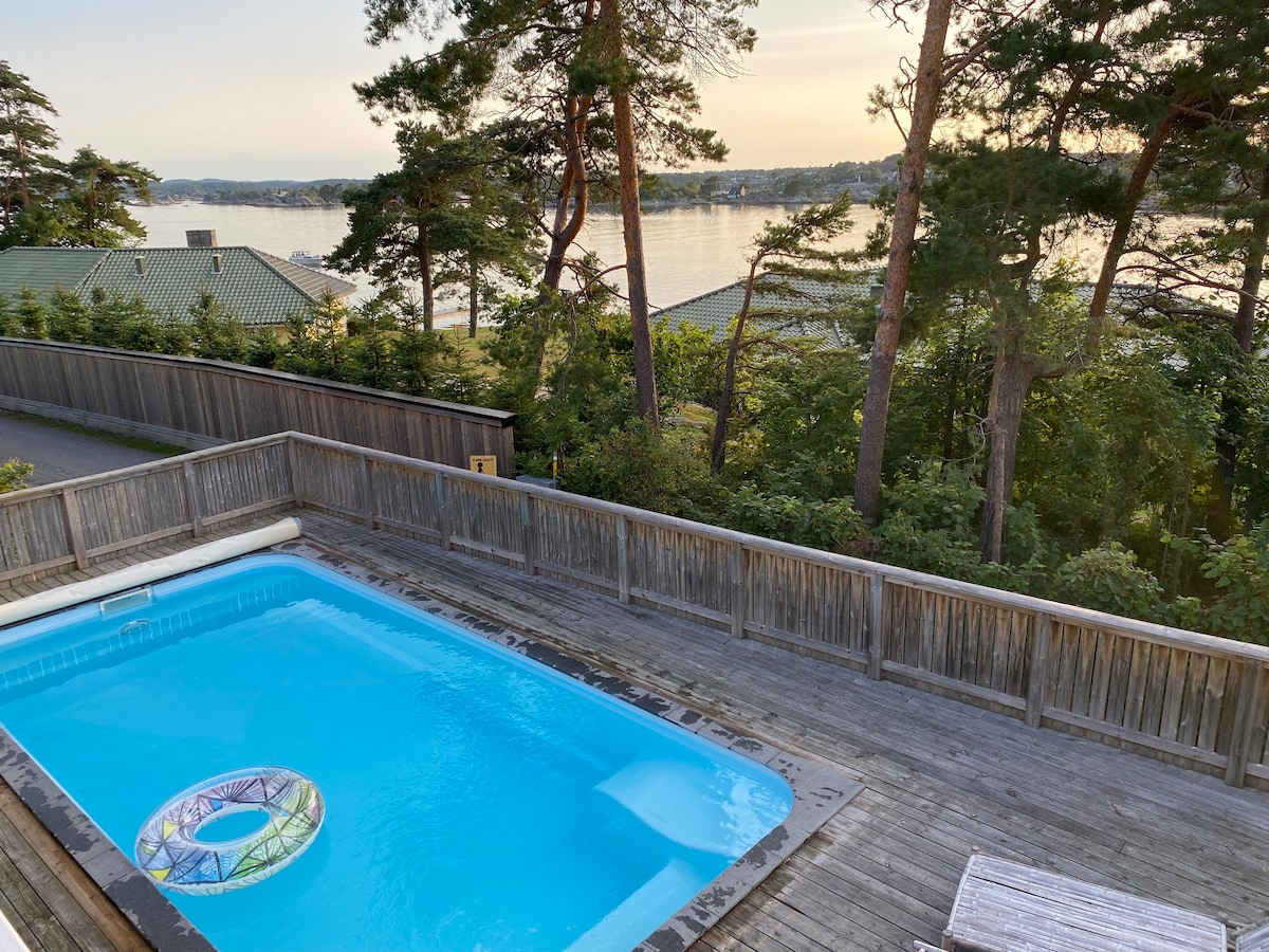 Spacious apartment with beautiful sea view and private pool. Train, beach, restaurants, Bølgen cultural house, Larvik city center etc. in the immediate vicinity. The apartment has a master bedroom with private bathroom and direct access to the pool as well as an extra bedroom with double bed and double bunk bed + extra bathroom. In addition to the spacious living room and kitchen, there is a glazed outdoor living room with a gas fireplace and a large terrace with a dining area. Playground and beach promenade right outside Perfect for two couples or a family with children and grandparents.
