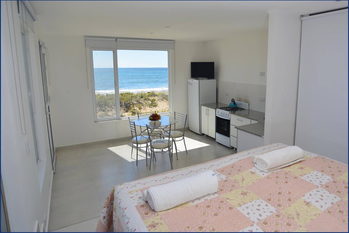Este encantador alojamiento ubicado sobre la arena, combina comodidad, estilo y vistas espectaculares al océano. Agua a 24°, las más cálidas de Argentina. El alojamiento cuenta con cocina de hornallas, con todos los utensillos, wifi con excelente conexión, agua caliente, gas, ropa de cama y toallas incluidos en la estadía. Este alojamiento es ideal para unas vacaciones relajadas ya que estamos sobre una de las playas menos transitadas de Las Grutas. El centro de las grutas esta a 7 km.
