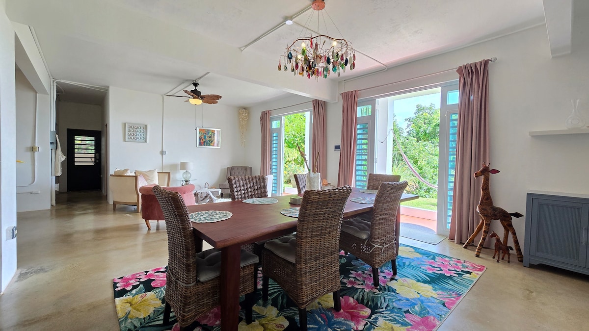 Casa Morivivi is located in the meadows of Juncos, in a one acre lot that forms part of a 30 acre private family farm. Admire the beautiful Puerto Rican countryside with dreamy views of the eastern mountains and El Yunque, right from your backyard. This is a place where you can see and feel the real Puerto Rico with the privacy of your own home and yard. Here you will find outdoor seating areas to relax in, fruit trees to pick, and household amenities that ensure a more than pleasant stay.