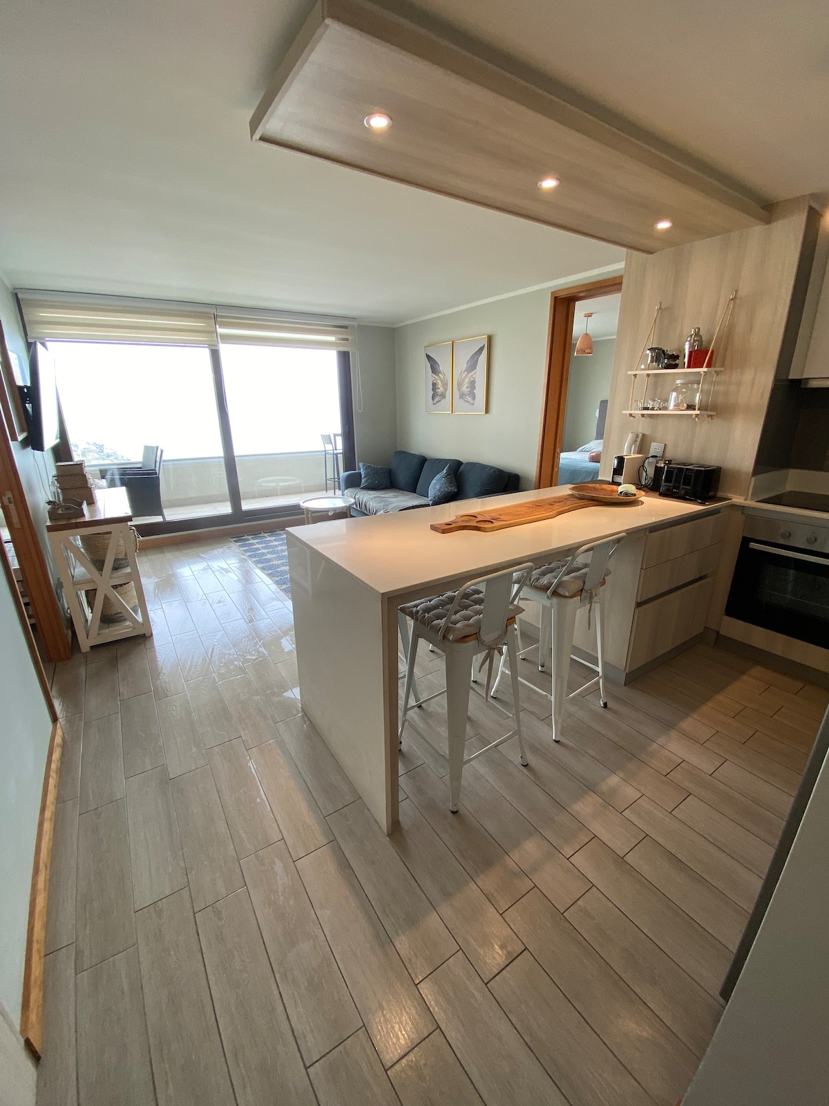 New apartment located in an exclusive neighborhood of Con con, Costa de Montemar. The apartment is furnished and fully equipped with internet access, a swimming pool, a gym, a sauna for rent, private parking, and a spectacular panoramic view. There is a supermarket and shops less than five minutes away and it is 100 meters from the Con Con dunes, ideal for two to three people, which is perfect for entertainment and rest.