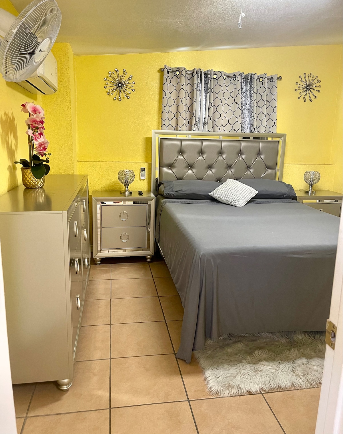 luxurious studio with private entrance, all decorated in black and white colors, has a kitchen with all kitchen accessories, queen bed, folding bed for another additional person, tv , air and heating are individual for the rest of the house since the studio has a mini split installed, it has a smoking area outside