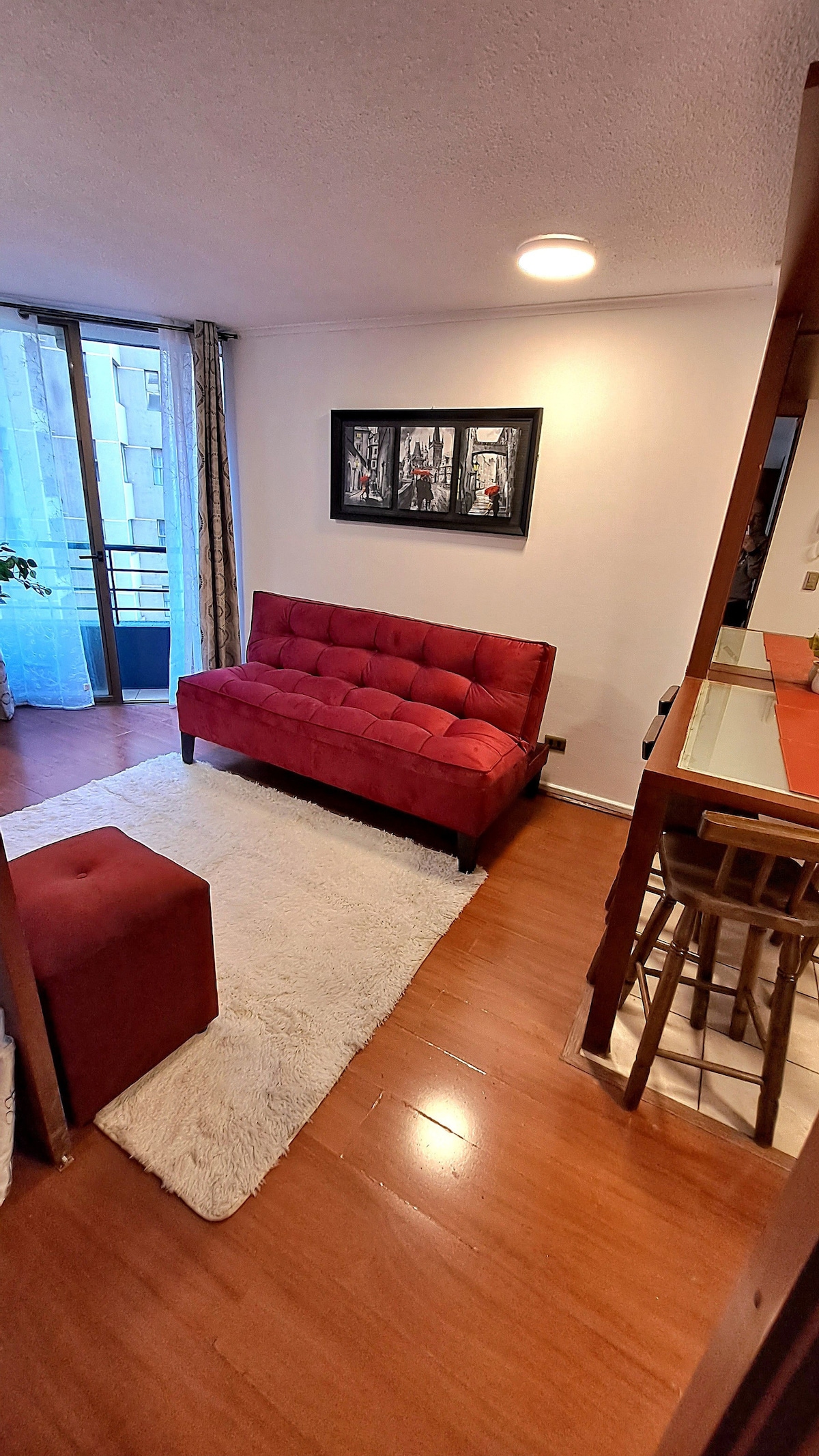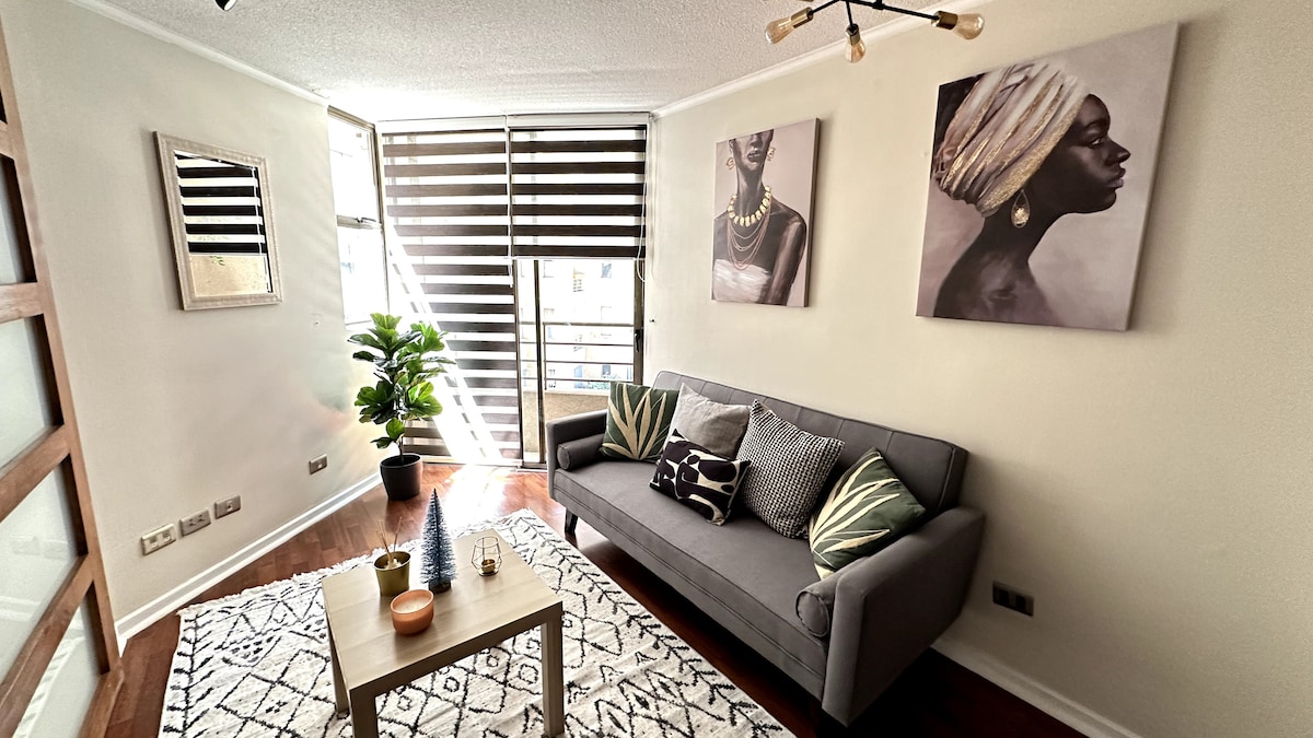 This apartment is ideal for relaxing and enjoying the city. It's centrally located, between the Santiago Centro and Providencia districts, one of the best locations in the city. It offers beautiful views of San Cristóbal Hill and the Sky Costanera. It's just a 3-minute walk from the metro and buses. Includes: Free Wi-Fi, a fully equipped kitchen, sheets and towels included, a large bed with a large Smart TV. Self-service entrance with a key, allowing you to arrive at any time.