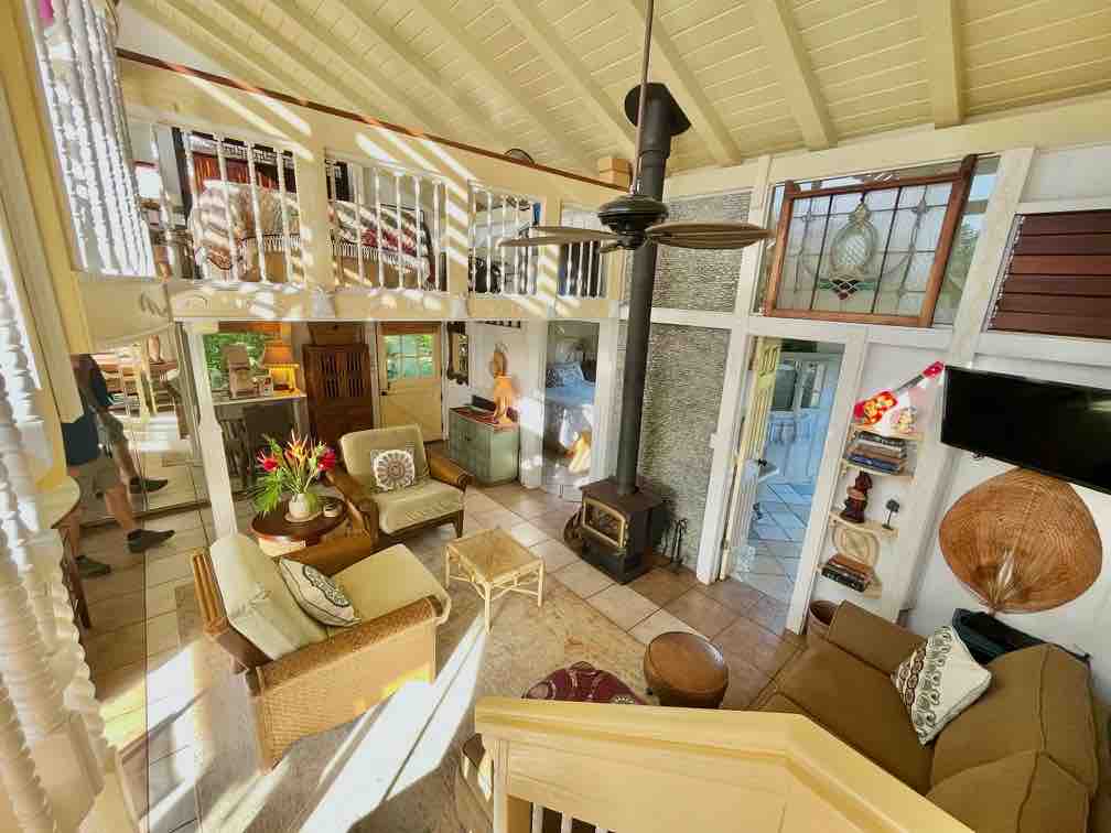 NOTE: This farm stay is not being phased out by County regulations. Many oceanfront condominiums are currently under threat of a phase-out. Farm stays are a "Permissible Use" on agricultural bona fide farms by State of Hawai'i law. Be assured your reservation here will be safe from government interference. This eclectic antique Hawaiian cottage is perched atop a scenic jungle gorge with breathtaking views in every direction. Open and breezy; attention to detail shines from every facet.