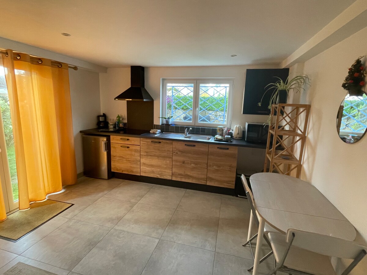 We will be delighted to welcome you to this 24 m2 studio, functional, all comfort, renovated, in a quiet, independent area, next to our residence, 10 minutes walk from the centre of Bergerac. It is equipped with all amenities: double bed, small living room, kitchen, independent bathroom, Freebox with wifi, TV, air conditioning, Plancha on demand...etc. . Outdoor relaxation area. New sheets, duvet and towels are provided. Free parking. All services nearby Andréa / Gérard