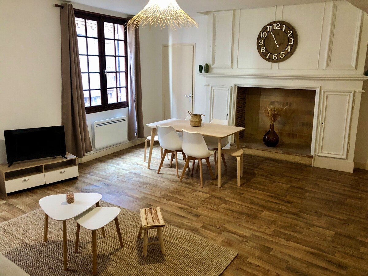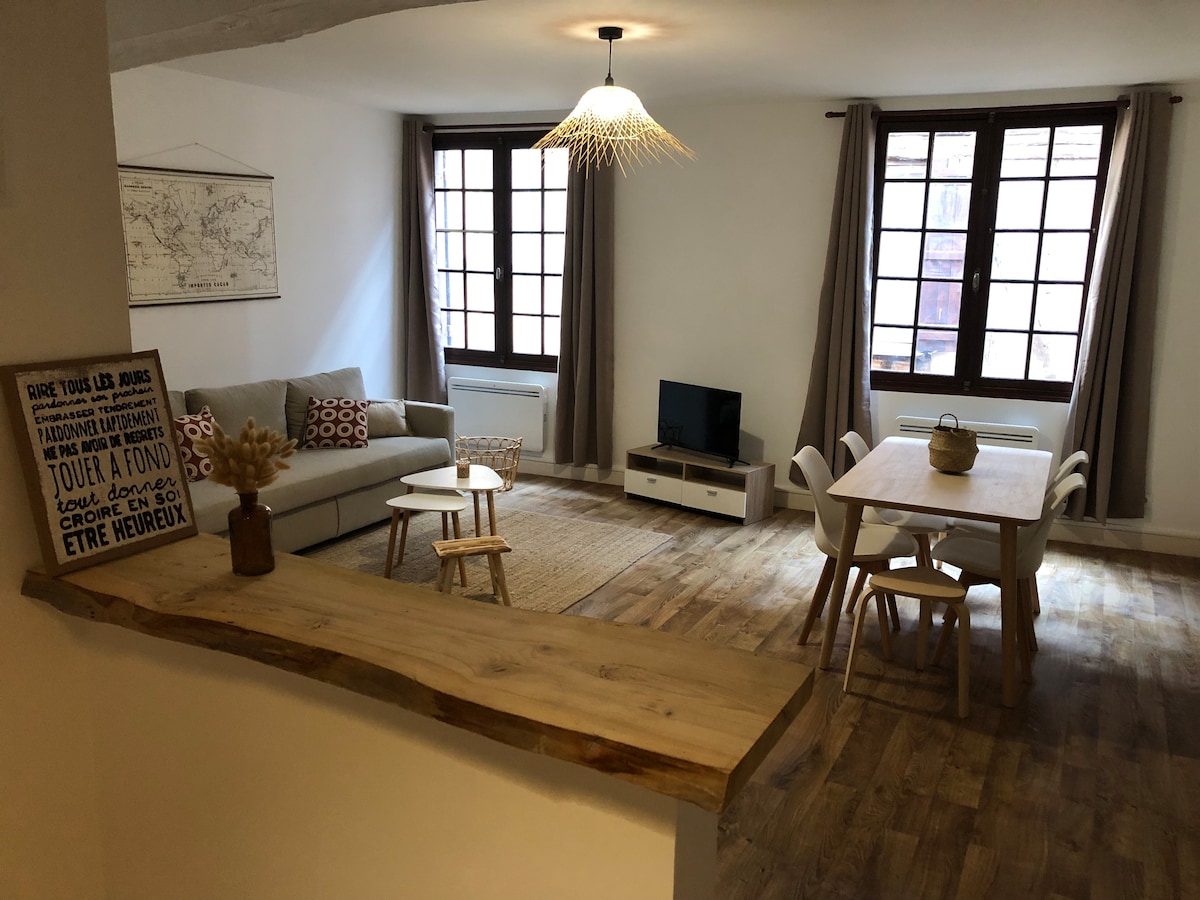 Cozy apartment on the second floor of a typical stone building in the historic center. This fully renovated 65 m2 apartment is located in the heart of old Bergerac, close to the port. The half-timbering and brick walls combine the charm of the building with the modernity of the accommodation. Its location makes it a perfect base for exploring the city. All shops, restaurants, museums are within walking distance.