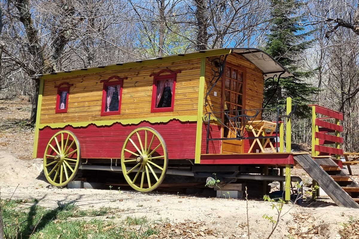 Come and discover the warm atmosphere of this trailer in this chestnut forest with pool. The red pink trailer is equipped with a kitchen (microwave oven, coffee maker, fridge, electric stove) A shower A toilet 2 bunk beds 1 sofa (in all 5 beds.) Animal park with aviary The pool is heated from May to September Small friendly restaurant to visit in the evening Many nice rivers Multitude of hikes CANYONING not far away