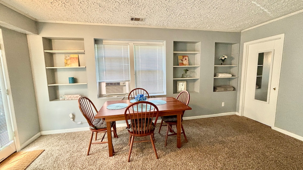 7mi. To gas south. Huge 1 bedrm. Guest/hse in a privt. home. Has a 240sqft. Brm w/King bed, closet, desk & TV. 225sqft. of a beautifully furnished livngrm w/a sofa and a twin sofa bed, centr. tble and a TV. Full kitchen/dining w/cook/eat dishes, stove w/oven, keurig, blender, toaster, d/wash, M/wave, ovn.stove & TV. A cozy bath w/tub & shower. Always equipped w/clean towels and the necessary toiletries & starter grooming items in case you forgot to bring yours.We have a laundry rm. w/wash&dryer