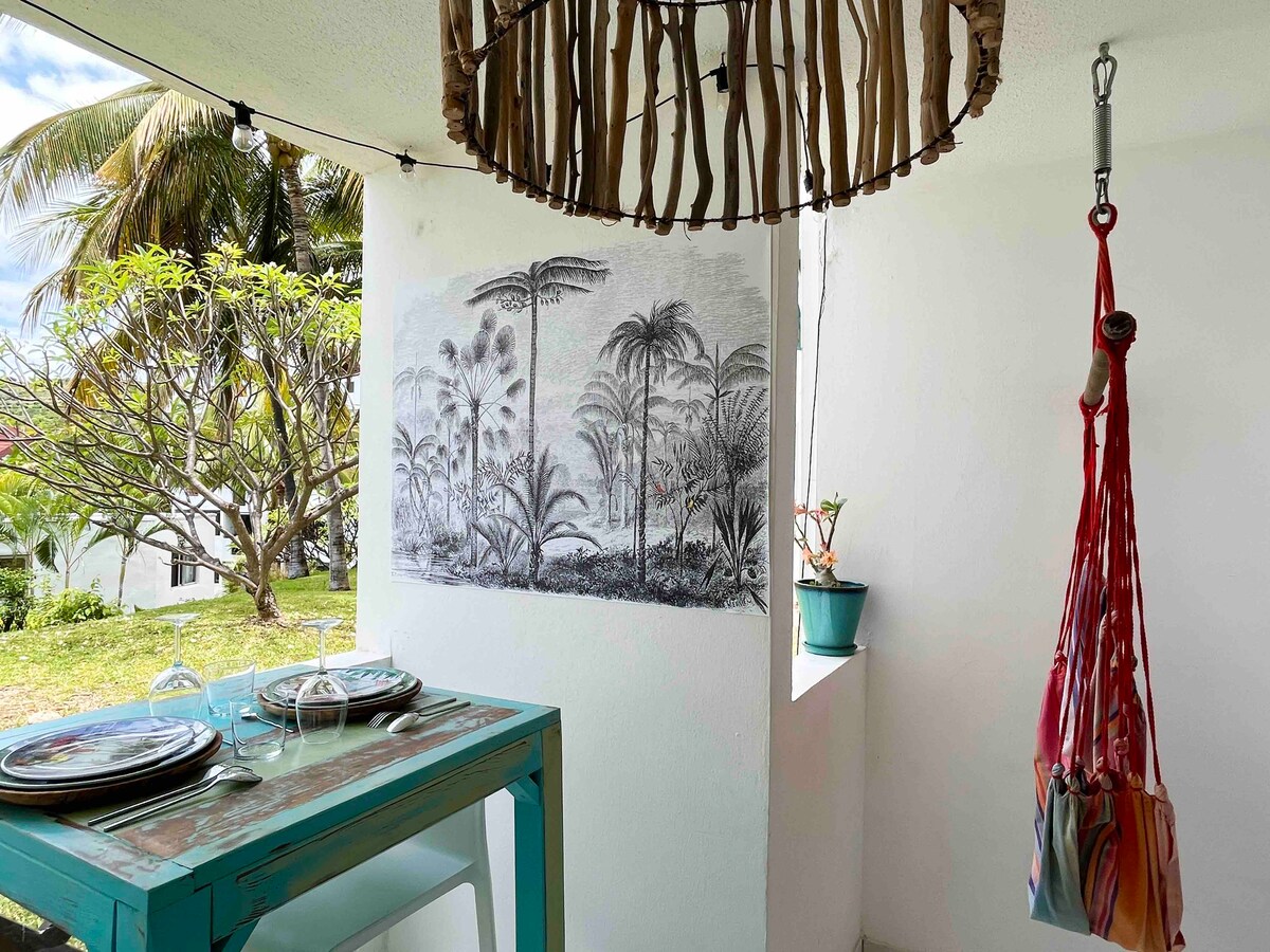 Ground floor independent of a box on stilts, located in a coconut grove. Scheduled for 2 people, it is composed of: - a bedroom, an outdoor bathroom (hot water) and toilet, an open space to the outside with equipped kitchenette and a garden with jacuzzi and pool. Located by the sea in the Bay of Saint Paul in an exceptional nature reserve (coconut grove and pond), close to downtown shops, Saint Paul market and the Tamarins road. Quiet place.