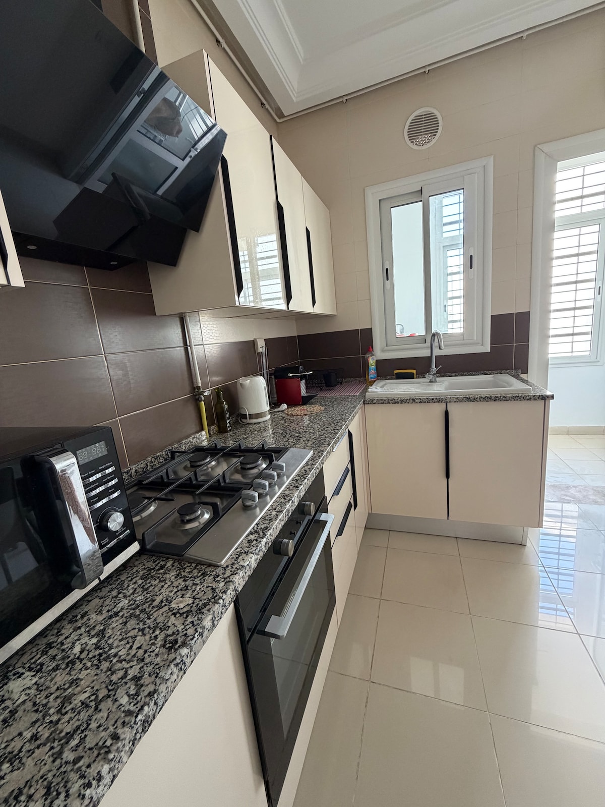 New S+2 apartment on the 1 st floor, modern and bright in the heart of Hay Wahat Laouina next to the Carrefour Express and Ben Yaghlen. Located 15 minutes from the airport. The apartment is composed of a comfortable living room, 2 bedrooms, a well-equipped kitchen and a modern bathroom. The residence is guarded 24 hours a day and equipped with double elevators. Enjoy with your family this fabulous place that offers good times in perspective.
