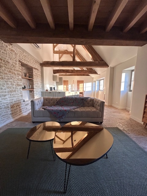In the heart of the charming village of Gamay-Saint-Aubin,this old house lives to the rhythm of the vine and wine,lovers of walking will be seduced by the beauty of the hillsides and the panoramic view. Ideally located:2 km from Puligny-Montrachet, 6 km from Meursault . This is a gite in an old house, identical to a loft with a large living room with a kitchen. The room is located high in a mezzanine with a large bed 160 x 190 (possibility to add a folding bed for children. Living room with sofa bed iKea. Kitchen: toaster, coffee maker, nespresso, toaster, mini oven, oven, induction cooktop, dishwasher, fridge freezer. No TV but a large library, board games, stereo with many CDs. Large sunny and furnished terrace of 60m2 with tables and loungers overlooking the garden. Bike loan on request. Backpack for hikes. Possibility of appointments with winemakers,tips on hikes. 2 night minimum stay