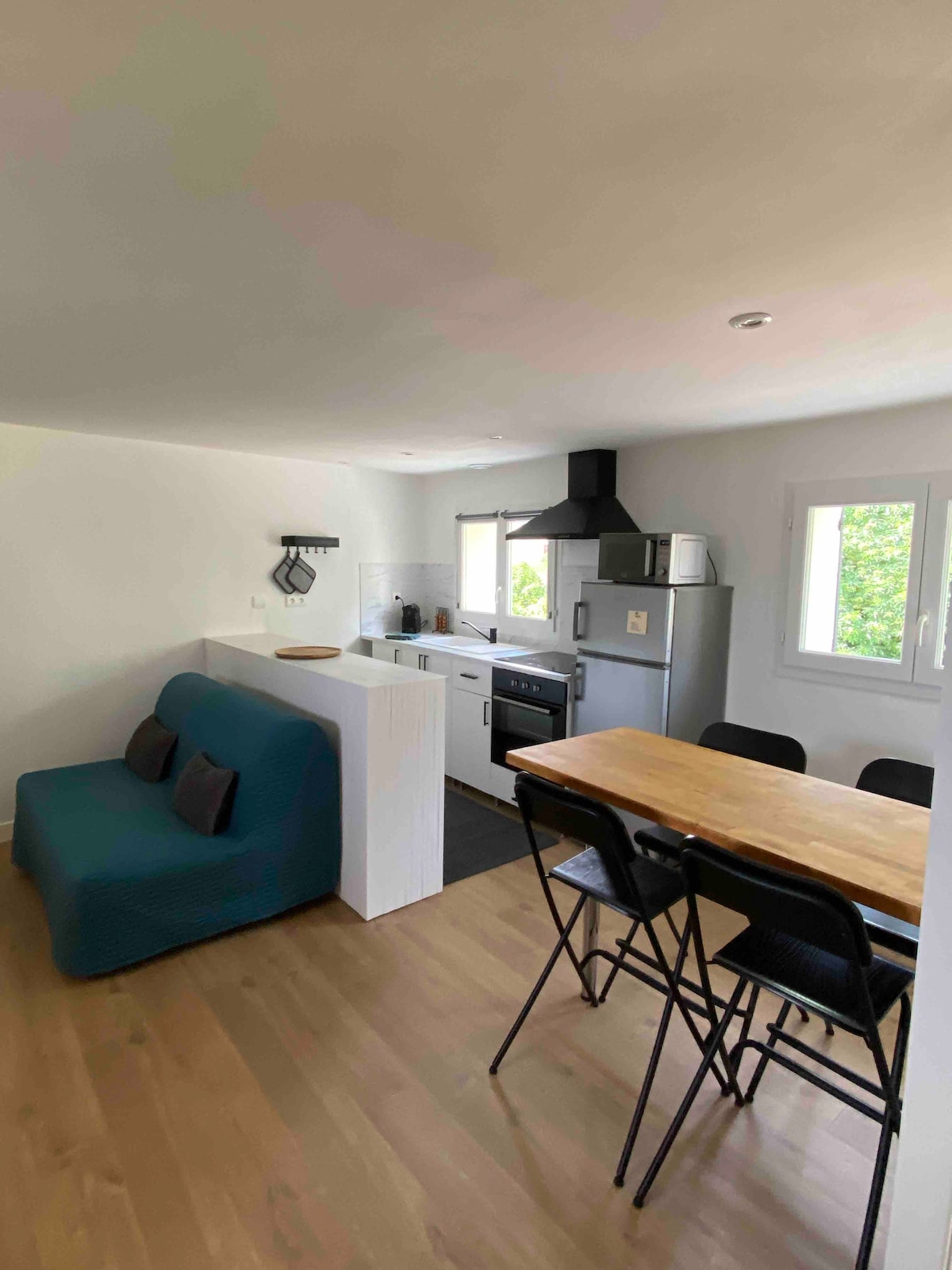 studio upstairs, renovated and air-conditioned, bedroom area with double bed, living room with sofa bed, TV, equipped kitchen (stovetop, oven, microwave, fridge-freezer, Nespresso...), bathroom with toilet, washing machine, vacuum cleaner... No smoking, no pets The property has an unsecured staircase, so it is not suitable for toddlers, no baby equipment. The apartment is configured to accommodate a maximum of 3 people, including children.