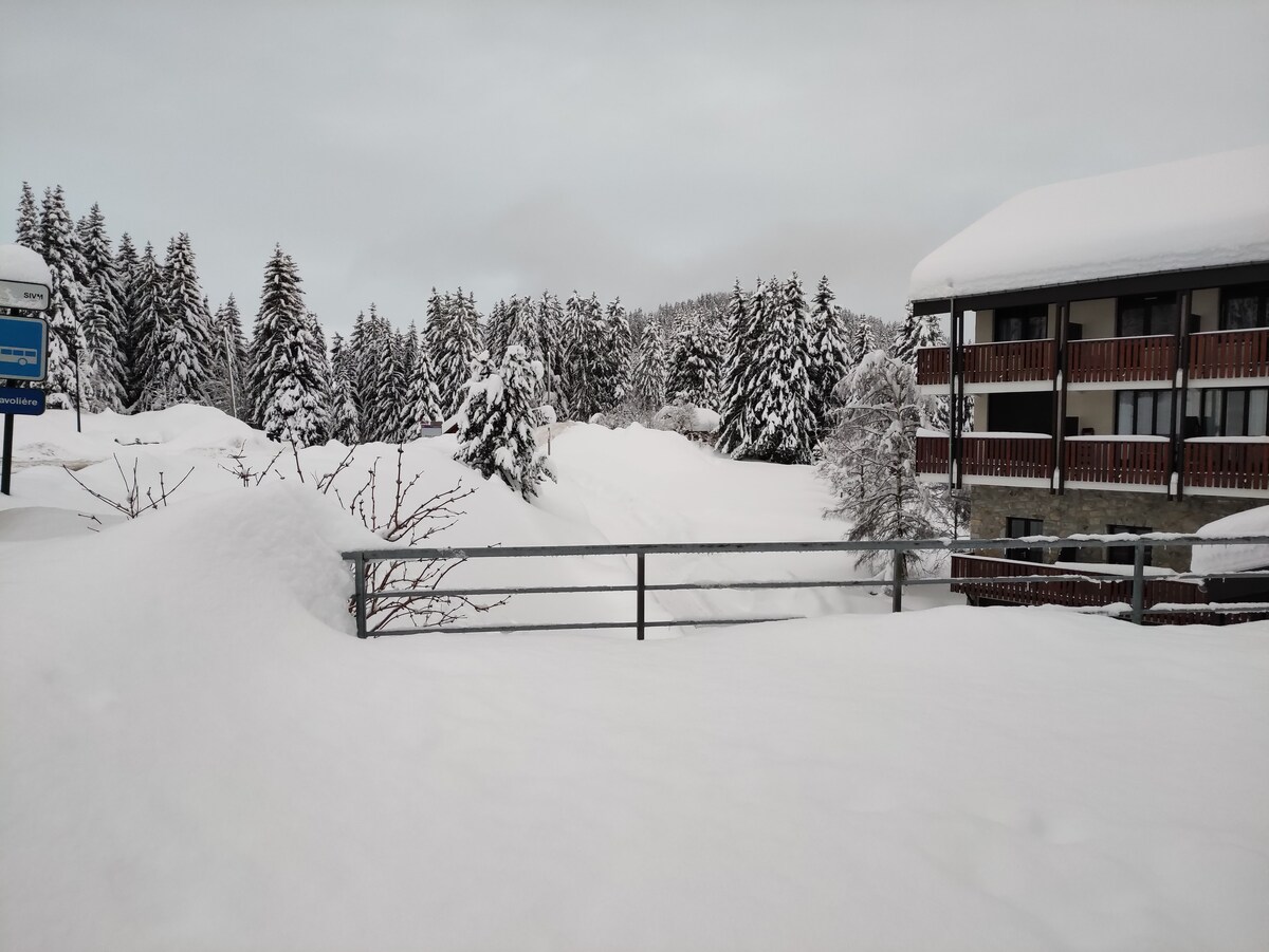 Cozy studio in quiet residence. - Mountain Corner (bunk beds) - Separate toilet (suspended storage cabinet) - Bathroom with bathtub + shower column - Living room: Dining area (folding table + chairs + storage bench) Kitchen area (induction stove, extractor hood, microwave oven, toaster, kettle, Nespresso coffee machine...) A sofa bed for 2 people (140/190) Storage furniture - Balcony (table + chairs) Wifi availability - 1 closed garage box + 1 ski locker - Outdoor parking