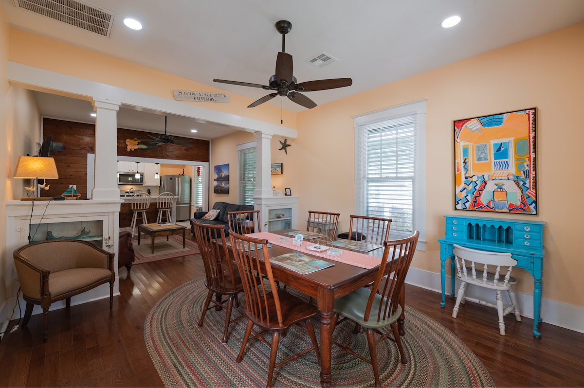 -Casita De Palmera- Relax on the lighted, palapa-covered deck with your coffee or cocktail! Family + pet friendly! Less than a half mile to Galveston's Historic Downtown area and a short 4 minute drive to the beach! Close to all of the fun, shopping, live music and restaurants on The Strand! -Fenced backyard -800+ MBPS Wifi -4 Smart TVs w/ Roku capability to stream with your accounts -Arcade & board games -Wood Grill -Beach towels & toys Close to cruise terminals & ONE block to cruise parking!