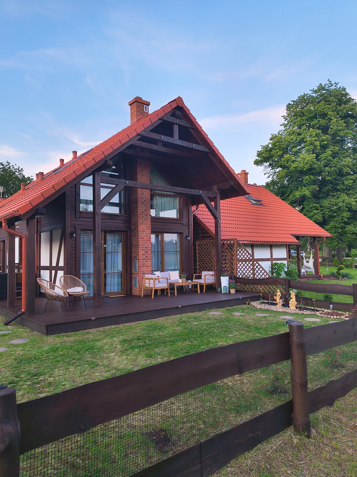 An atmospheric holiday home in an intimate area, with access to Lake by a private road (several dozen meters) * Perfect location: away from the hustle and bustle and tourists, * Additional free equipment of the cottage is a kayak, 2 bicycles, * Perfect for couples, families with children or a group of friends. Near: * Yacht port, water equipment rental, *Restaurant, *Forest, * Valley of Kashubian Palaces, * Recreational and Olympic swimming pool, gym, SPA, bowling, * Easy access to the sea