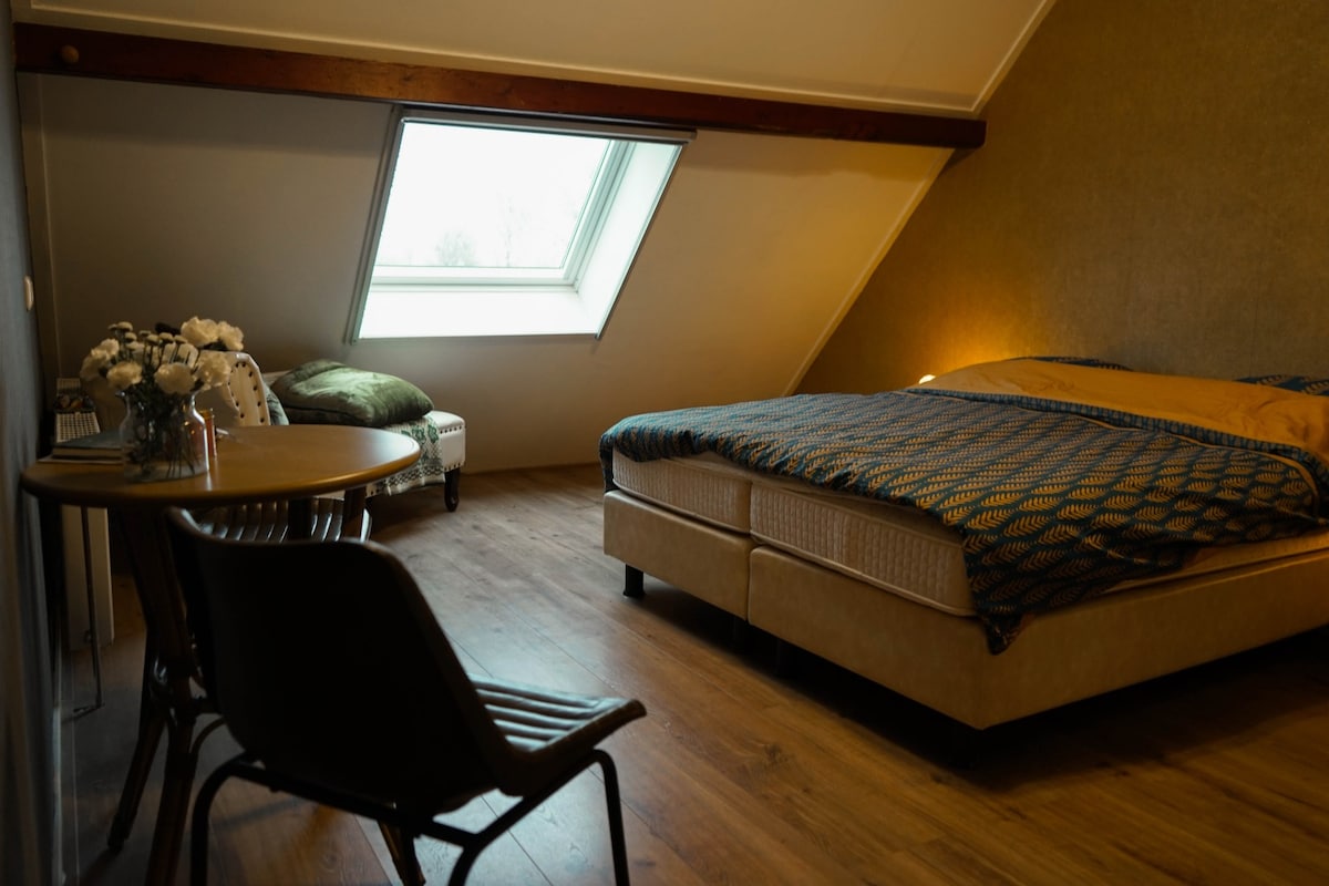Ons woonhuis is een voormalig bedrijfspand en had nogal wat ruimte over. Waar voorheen de winkel-/kantoorruimtes met klantentoilet waren, hebben wij in het najaar van 2019 een slaapkamer, woonruimte met kitchenette (met koffie- en thee voorzieningen/koelkastje) en toilet/douche gerealiseerd. De winkelentree is nu een privé-ingang voor ons gastenverblijf. Ontbijt bestellen is mogelijk, dit is echter niet standaard bij de basisprijs inbegrepen.