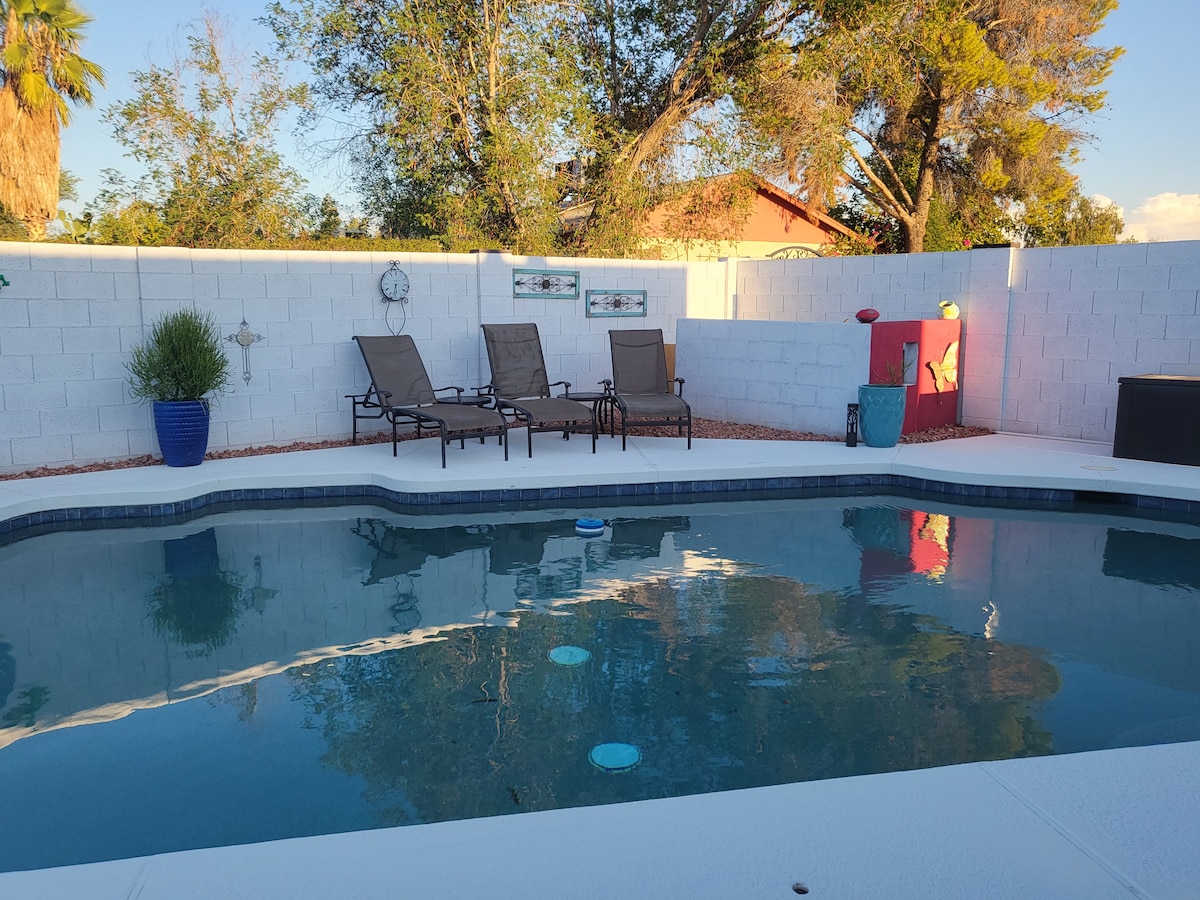This unique stay is great for those who want to relax or work while exploring central Tempe. The main feature is a pool (heated) with an outdoor shower. The house has 3 rooms (1 king, 1 queen, 1 twin daybed with a twin trundle that lays flat on the ground). There are two desks for those who want to work remotely . We are located 10 minutes drive from ASU and Mill Avenue (downtown Tempe). South Mountain < 10 minutes away, Sky Harbor Airport <15 minutes. No more than 6 guests at the house.