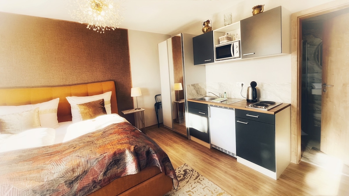 If you really want to switch off, need new spirit and are satisfied with minimalist furnishings, but appreciate the luxury of freedom, evening sunsets from your terrace, birdsong in the morning and the mooing of happy cows, you've come to the right place. You can prepare your meals in the tiny house yourself or order an organic breakfast basket for a healthy start to the day. There is a compost toilet and an outdoor shower is planned.