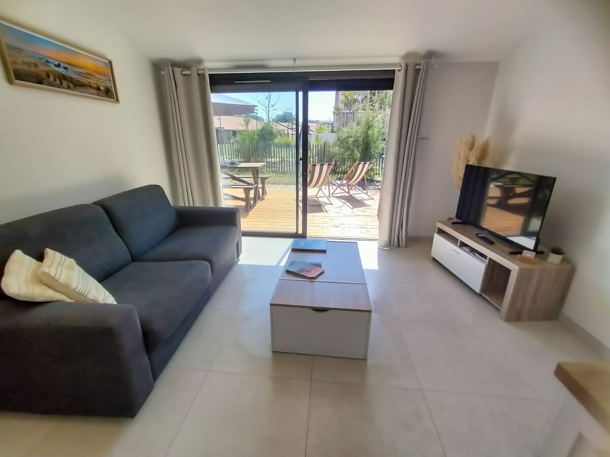Come and relax in peace in our brand new 26 m2 2-room apartment. Located between the Landes and the Basque Country, 5 min from the beach and 20 min from the Spanish border. Close to all amenities: Bakery, Hypermarket, Cinema, Trambus... Accommodation consists of a kitchen equipped with oven, induction cooktop, microwave, washing machine etc. Living room, sofa, TV and WiFi. Bedroom with double bed, wardrobes and shower room. Private parking Private landscaped garden with terrace, garden furniture, plancha...