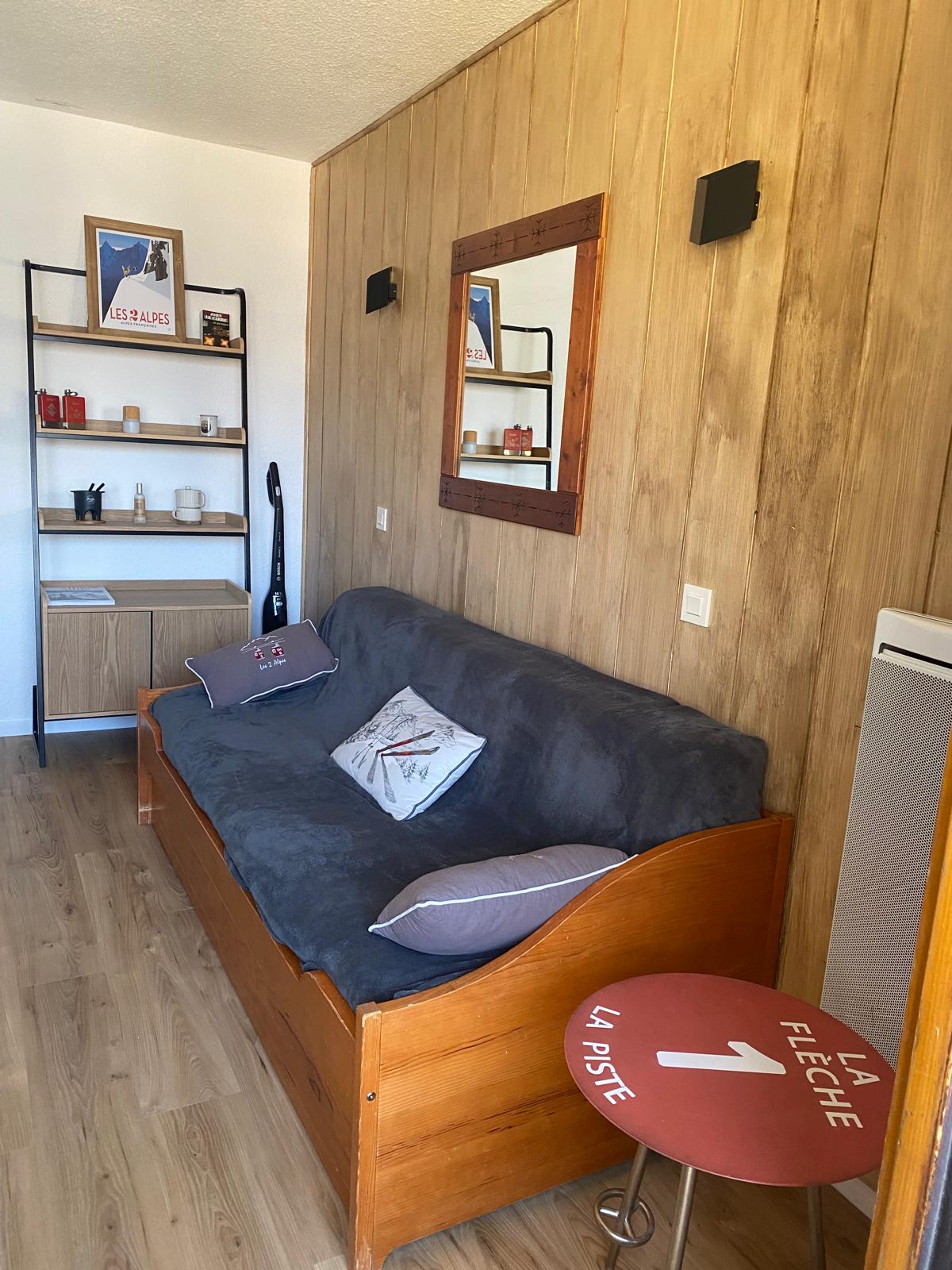 12 m2 studio at the foot of the slopes in the center of the resort (Côte Brune residence, 3-minute walk to the Jandri Express). Living room with 130 x 190 convertible sofa (200 x 200 duvet + 2 pillows) and flat-screen TV, bathroom with shower, sink and toilet. Equipped kitchenette, microwave, oven, Senseo coffee machine. Ski locker. Close to all shops. Residence with keypad. Standard apartment cleaning is included. Linens and towels are not provided.