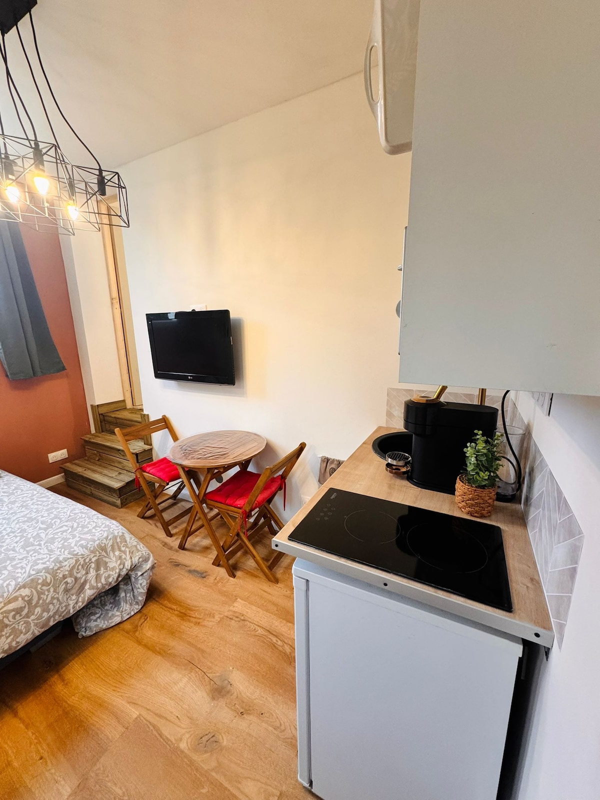 Profitez d'un logement élégant et au centre du village de Gonfaron. Nous vous proposons ce petit studio de 15m2 avec son canapé convertible à ouverture facile et de son matelas de 18cm épaisseur,d’une kitchenette avec sa plaque double feu à induction, son frigo top meuble de rangement, micro onde grill , hotte aspirante et évier rond en inox. Salle d’eau avec lavabo, wc.