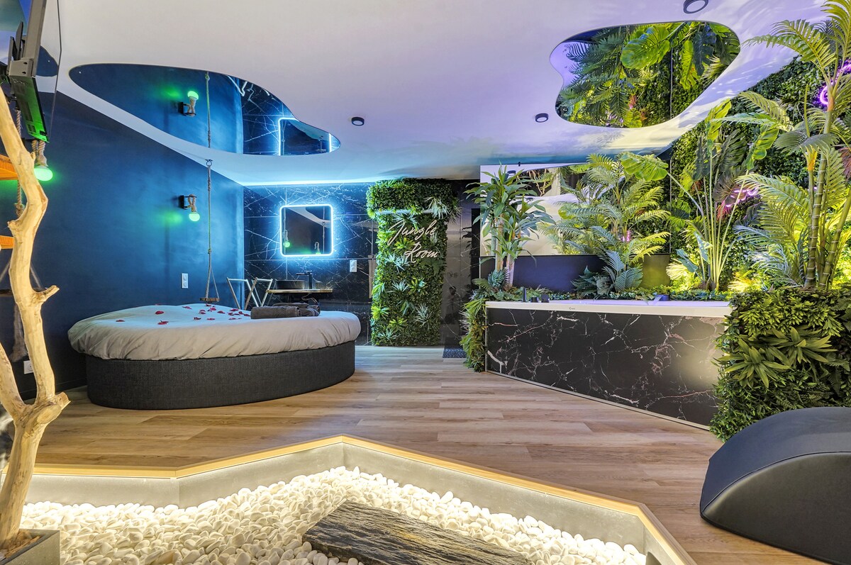 Whether it's for a romantic getaway, a special celebration or just to create unforgettable memories, our 50 m2 Jungle Room is the perfect place to relax and reconnect with your partner. Extras on order or on site: - Champagne ≈ €45 - Love Box ≈ €40-50 - Romantic Decoration = €30 Room standing: - Balneo 190x120 - Round Bed 200 x 200 - Air conditioning - Furnished kitchen - XXL Double Shower - 15 m walk to the Capitol