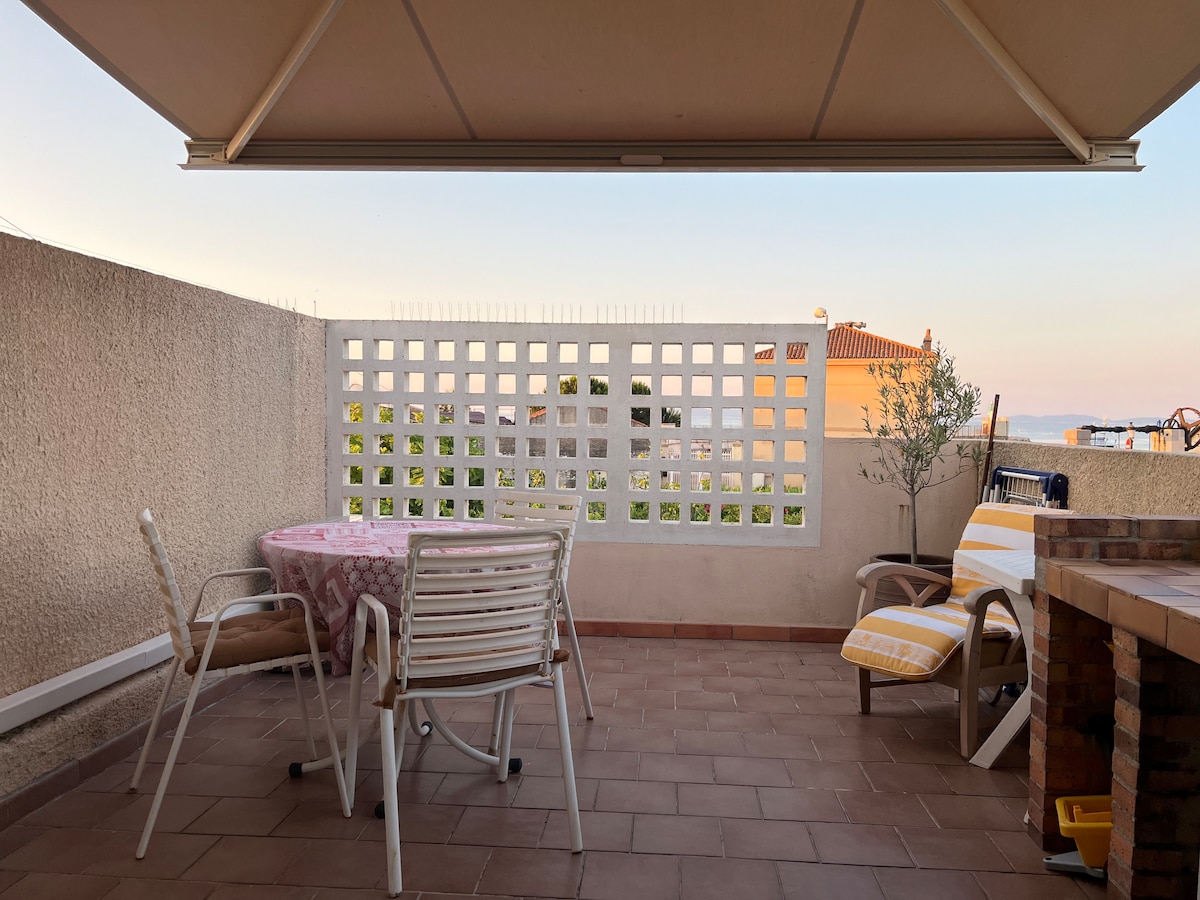 Take it easy at this unique and tranquil getaway. Protected duplex environment on the first floor facing the Hyères Islands, direct beach access, parking Downstairs: bathroom with toilet, kitchen, living room with 140 sofa bed, terrace with sea view. Upstairs 1 bedroom with a 140 bed, large closets, TV and ceiling fan + mezzanine with 140 sofa bed For safety reasons (open mezzanine, spiral staircase) the stay is not recommended for families with young children.